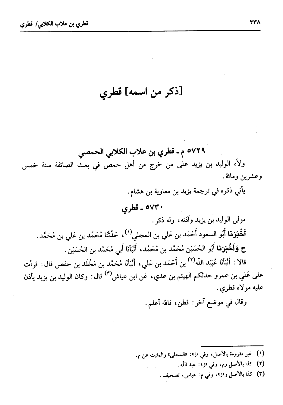 5729 - قطري بن علاب الكلابي الحمصي ولاه الوليد بن يزيد على من خرج من أهل حمص في بعث الصائفة سنة خمس وعشرين ومائة يأتي ذكره في ترجمة يزيد بن معاوية بن هشام 5730 قطري مولى الوليد بن يزيد وآذنه وله ذكر أخبرنا أبو السعود أحمد بن علي بن المجلي (1) حدثنا محمد بن علي بن محمد وأخبرنا أبو الحسين محمد بن محمد أنبأنا أبي محمد بن الحسين قالا أنبأنا عبيد الله (2) بن أحمد بن علي أنبأنا محمد بن مخلد بن حفص قال قرأت على علي بن عمرو حدثكم الهيثم بن عدي عن ابن عياش (3) قال وكان الوليد بن يزيد يأذن عليه مولاه قطري وقال في موضع آخر قطن فالله أعلم