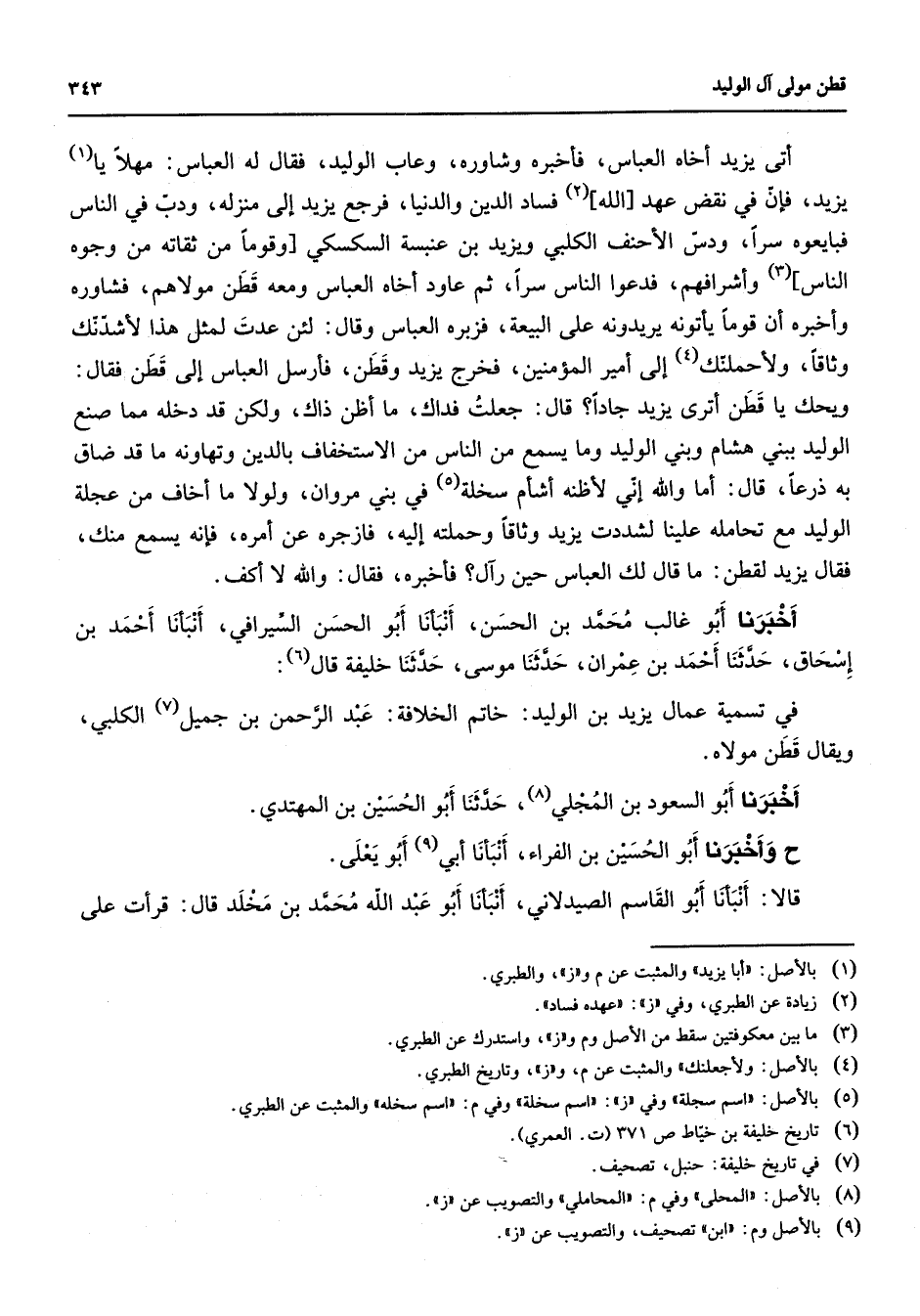 أتى يزيد أخاه العباس فأخبره وشاوره وعاب الوليد فقال له العباس مهلا يا (1) يزيد فإن في نقض عهد الله (2) فساد الدني والدنيا فرجع يزيد إلى منزله ودب في الناس فبايعوه سرا ودس الأحنف الكلبي ويزيد بن عنبسة السكسكي وقوما من ثقاته من وجوه الناس (3) وأشرافهم فدعوا الناس سرا ثم عاود أخاه العباس ومعه قطن مولاهم فشاوره وأخبره أن قوما يأتونه يريدونه على البيعة فزبره العباس وقال لئن عدت لمثل هذا لأشدنك وثاقا ولأحملنك (4) إلى أمير المؤمنين فخرج يزيد وقطن فأرسل العباس إلى قطن فقال ويحك يا قطن أترى يزيد جادا قال جعلت فداك ما أظن ذاك ولكن قد دخله مما صنع الوليد ببني هشام وبني الوليد وما يسمع من الناس من الاستخفاف بالدين وتهاونه ما قد ضاق به ذرعا قال اما والله إني لأظنه أشأم سخلة (5) في بني مروان ولولا ما أخاف من عجلة الوليد مع تحامله علينا لشددت يزيد وثاقا وحملته إليه فازجره عن أمره فإنه يسمع منك فقال يزيد لقطن ما قال لك العباس حين رآل فأخبره فقال والله لا أكف أخبرنا أبو غالب محمد بن الحسن أنبأنا أبو الحسن السيرافي أنبأنا أحمد بن إسحاق حدثنا أحمد بن عمران حدثنا موسى حدثنا خليفة قال (6) في تسمية عمال يزيد بن الوليد خاتم الخلافة عبد الرحمن بن جميل (7) الكلبي ويقال قطن مولاه أخبرنا أبو السعود بن المجلي (8) حدثنا أبو الحسين بن المهتدي وأخبرنا أبو الحسين بن الفراء أنبأنا أبي (9) أبو يعلى قالا أنبأنا أبو القاسم الصيدلاني أنبأنا أبو عبد الله محمد بن مخلد قال قرأت على