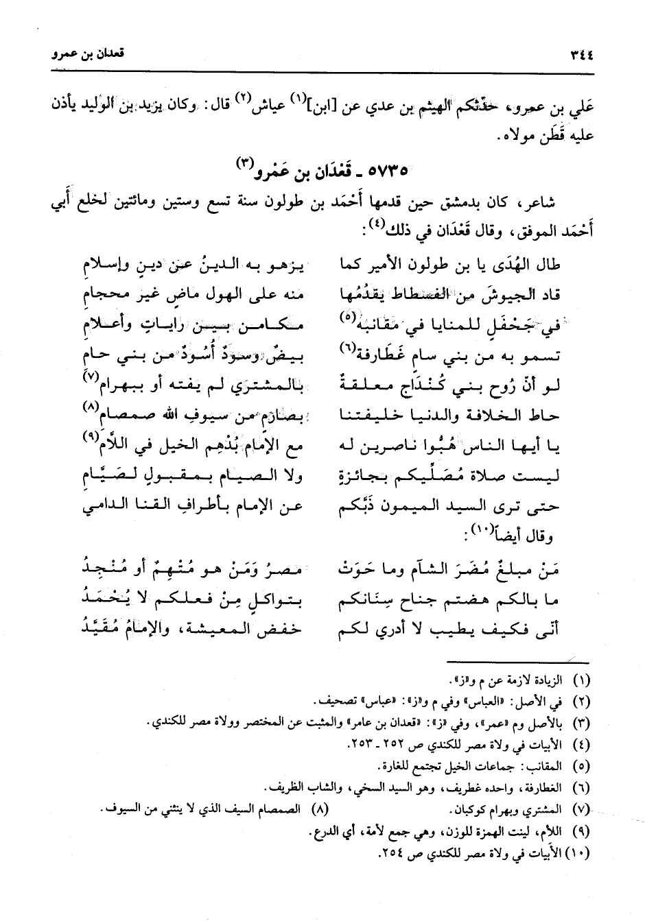 5735 - قعدان بن عمرو (3) شاعر كان بدمشق حين قدمها أحمد بن طولون سنة تسع وستين ومائتين لخلع أبي أحمد الموفق وقال قعدان في ذلك (4) طال الهدى يا بن طولون الأمير كما * يزهو به الدين عن دين وإسلام قاد الجيوش من الفسطاط يقدمها * منه على الهول ماض غير محجام في جحفل للمنايا في مقانبه (5) * مكامن بين رايات وأعلام تسمو به من بني سام غطارفة (6) * بيض وسود أسود من بني حام لو أن روح بني كنداج معلقة * بالمشتري لم يفته أو ببهرام (7) حاط الخلافة والدنيا خليفتنا * بصارم من سيوف الله صمصام (8) يا أيها الناس هبوا ناصرين له * مع الإمام بدهم الخيل في اللام (9) ليست صلاة مصليكم بجائزة * ولا الصيام بمقبول لصيام حتى ترى السيد الميمون ذبكم * عن الإمام بأطراف القنا الدامي * وقال أيضا (10) من مبلغ مضر الشآم وما حوت * مصر ومن هو متهم أو منجد ما بالكم هضتم جناح سنانكم * بتواكل من فعلكم لا يحمد أنى فكيف يطيب لا أدري لكم * خفض المعيشة والإمام مقيد