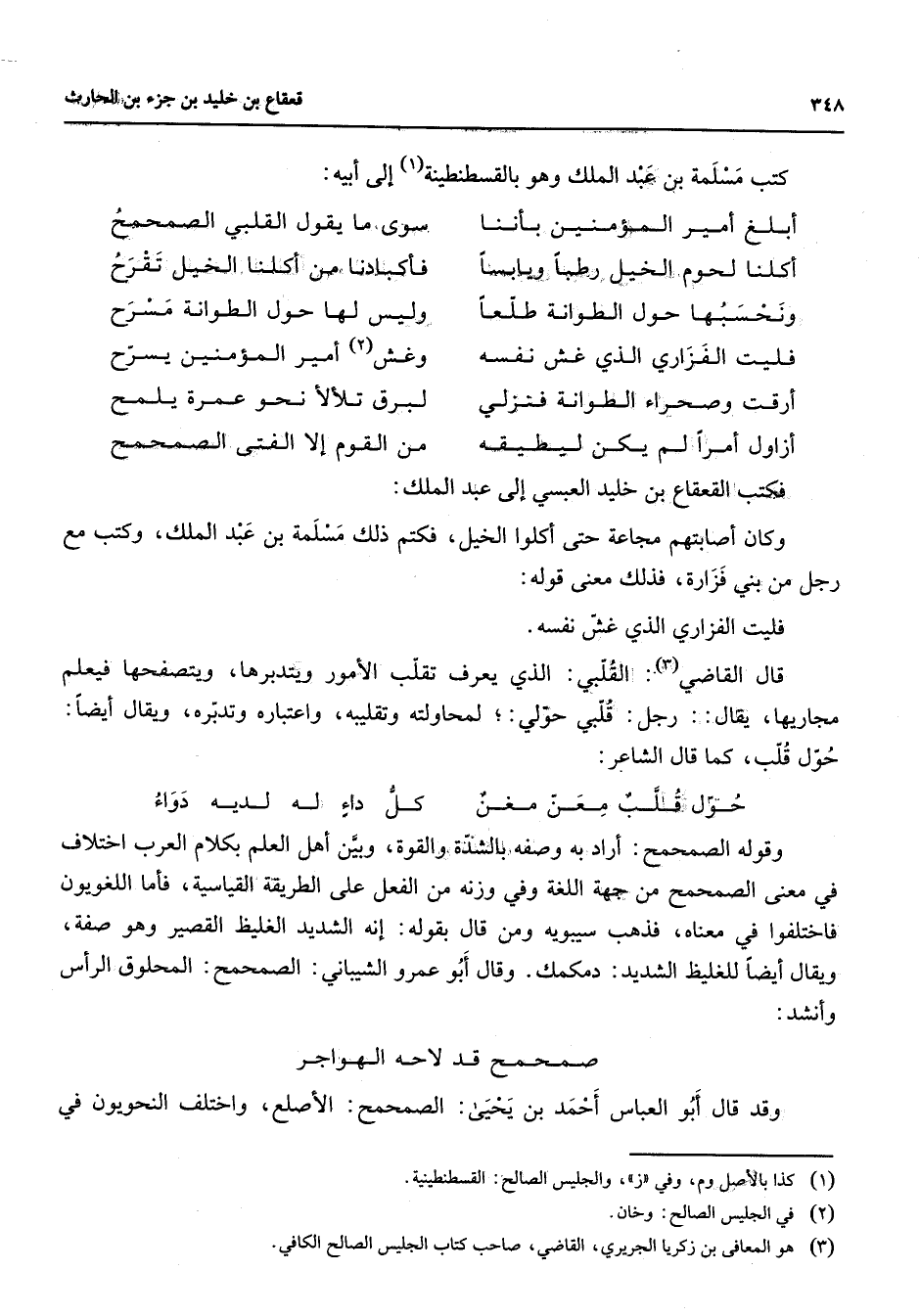 كتب مسلمة بن عبد الملك وهو بالقسطنطينية (1) إلى أبيه * أبلغ أمير المؤمنين بأننا * سوى ما يقول القلبي الصمحمح * أكلنا لحوم الخيل رطبا ويابسا * فأكبادنا من أكلنا الخيل تقرح ونحبسها حول الطوانة طلعا * وليس لا حول الطوانة مسرح فليت الفزاري الذي غش نفسه * وغش (2) أمير المؤمنين يسرح أرقت وصحراء الطوانة فنزلي * لبرق تلألأ نحو عمرة يلمح أزاول أمرا لم يكن ليطيقه * من القوم إلا الفتى الصمحمح * فكتب القعقاع بن خليد العبسي إلى عبد اللمك وكان أصابتهم مجاعة حتى أكلوا الخيل فكتم ذلك مسلمة بن عبد الملك وكتب مع رجل من بني فزارة فذلك معنى قوله فليت الفزاري الذي غش نفسه قال القاضي (3) القلبي الذي يعرف تقلب الأمور ويتدبرها ويتصفحها فيعلم مجاريها يقال رجل قلبي حولي لمحاولته وتقليبه واعتباره وتدبره ويقال أيضا حول قلب كما قال الشاعر * حول قلب معن مغن * كل داء له لديه دواء * وقوله الصمحمح أراد به وصفه بالشدة والقوة وبين أهل العلم بكلام العرب اختلاف في معنى الصمحمح من جهة اللغة وفي وزنه من الفعل على الطريقة القياسية فأما اللغويون فاختلفوا في معناه فذهب سيبويه ومن قال بقوله إنه الشديد الغليظ القصير وهو صفة ويقال أيضا للغليظ الشديد دمكمك وقال أبو عمرو الشيباني الصمحمح المحلوق الرأس وأنشد * صمحمح قد لاحه الهواجر وقد قال أبو العباس أحمد بن يحيى الصمحمح الأصلع واختلف النحويون في