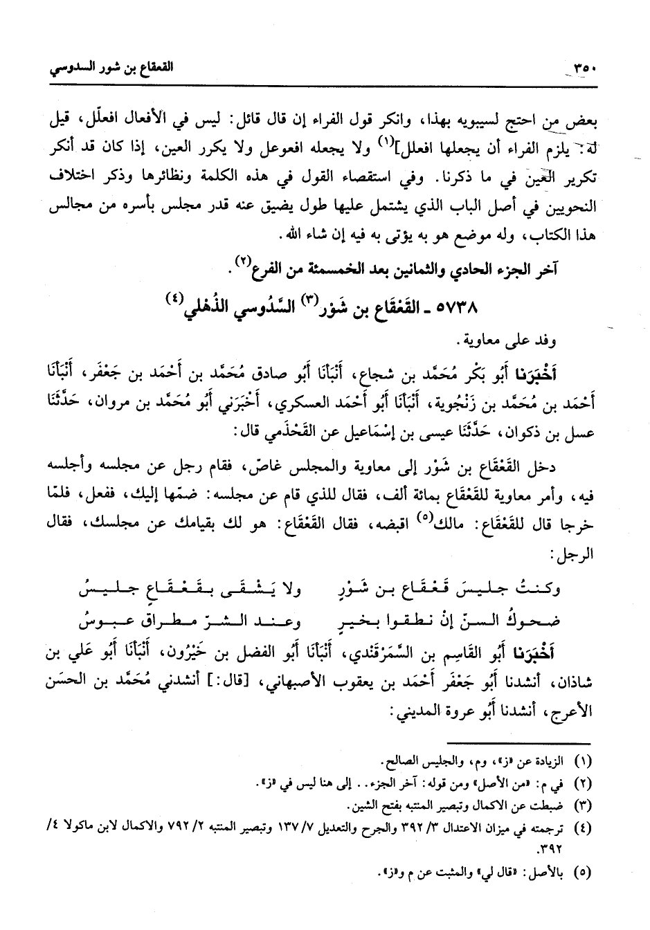 5738 - القعقاع بن شور (3) السدوسي الذهلي (4) وفد على معاوية أخبرنا أبو بكر محمد بن شجاع أنبأنا أبو صادق محمد بن أحمد بن جعفر أنبأنا أحمد بن محمد بن زنجوية أنبأنا أبو أحمد العسكري أخبرني أبو محمد بن مروان حدثنا عسل بن ذكوان حدثنا عيسى بن إسماعيل عن القحذمي قال دخل القعقاع بن شور إلى معاوية والمجلس غاص فقام رجل عن مجلسه وأجلسه فيه وأمر معاوية للقعقاع بمائة ألف فقال للذي قام عن مجلسه ضمها إليك ففعل فلما خرجا قال للقعقاع مالك (5) اقبضه فقال القعقاع هو لك بقيامك عن مجلسك فقال الرجل * وكنت جليس قعقاع بن شور * ولا يشقى بقعقاع جليس ضحوك السن إن نطقوا بخير * وعند الشر مطراق عبوس * أخبرنا أبو القاسم بن السمرقندي أنبأنا أبو الفضل بن خيرون أنبأنا أبو علي بن شاذان أنشدنا أبو جعفر أحمد بن يعقوب الأصبهاني قال أنشدني محمد بن الحسن الأعرج أنشدنا أبو عروة المديني
