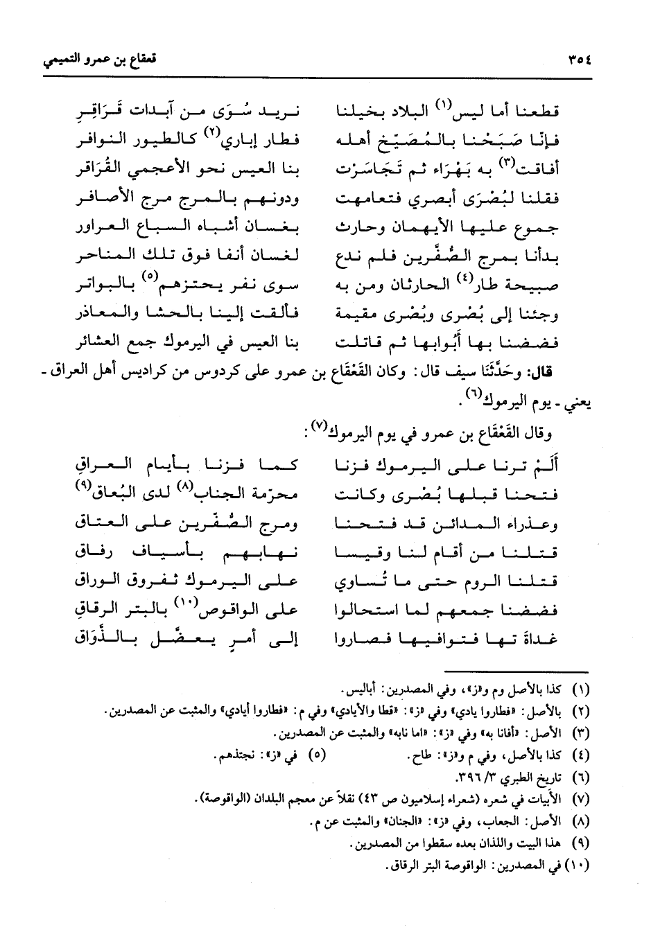 * قطعنا أما ليس (1) البلاد بخيلنا * نريد سوى من آبدات قراقر * فإنا صبحنا بالمصيخ أهله * فطار (2) إباري كالطيور النوافر * أفاقت (3) به بهراء ثم تجاسرت * بنا العيس نحو الأعجمي القراقر فقلنا لبصري أبصري فتعامهت * ودونهم بالمرج مرج الأصافر جموع عليها الأيهمان وحارث * بغسان أشباه السباع العراور بدأنا بمرج الصفرين فلم ندع * لغسان أنفا فوق تلك المناحر صبيحة طار (4) الحارثان ومن به * سوى نفر يحتزهم (5) بالبواتر وجئنا إلى بصرى وبصرى مقيمة * فألقت إلينا بالحشا والمعاذر فضضنا بها أبوابها ثم قاتلت * بنا العيس في اليرموك جمع العشائر * قال وحدثنا سيف قال وكان القعقاع بن عمرو على كردوس من كراديس أهل العراق يعني يوم اليرموك (6) وقال القعقاع بن عمرو في يوم اليرموك (7) * ألم ترنا على اليرموك فزنا * كما فزنا بأيام العراق فتحنا قبلها بصرى وكانت * محرمة الجناب (8) لدى البعاق (9) وعذراء المدائن قد فتحنا * ومرج الصفرين على العتاق قتلنا من أقام لنا وقيسا * نهابهم بأسياف رفاق قتلنا الروم حتى ما تساوي * على اليرموك ثفروق الوراق فضضنا جمعهم لما استحالوا * على الواقوص (10) بالبتر الرقاق غداة تها فتوافيها فصاروا * إلى أمر يعضل بالذواق *