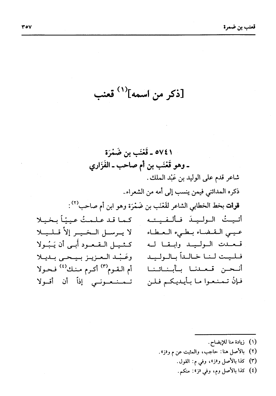 5741 - قعنب بن ضمرة وهو قعنب بن أم صاحب الفزاري شاعر قدم على الوليد بن عبد الملك ذكره المدائني فيمن ينسب إلى أمه من الشعراء قرأت بخط الخطابي الشاعر لقعنب بن ضمرة وهو ابن أم صاحب (2) * أتيت الوليد فألفيته * كما قد علمت عييا بخيلا عيي القضاء بطئ العطاء * لا يرسل الخير إلا قليلا قعدت الوليد وابقا له * كثيل القعود أبى أن يبولا فليت لنا خالدا بالوليد * وعبد العزيز بيحى بديلا أنحن قعدنا بأبنائنا * أم القوم (3) أكرم منك (4) فحولا فإن تمنعوا ما بأيديكم فلن * تمنعوني إذا أن أقولا *
