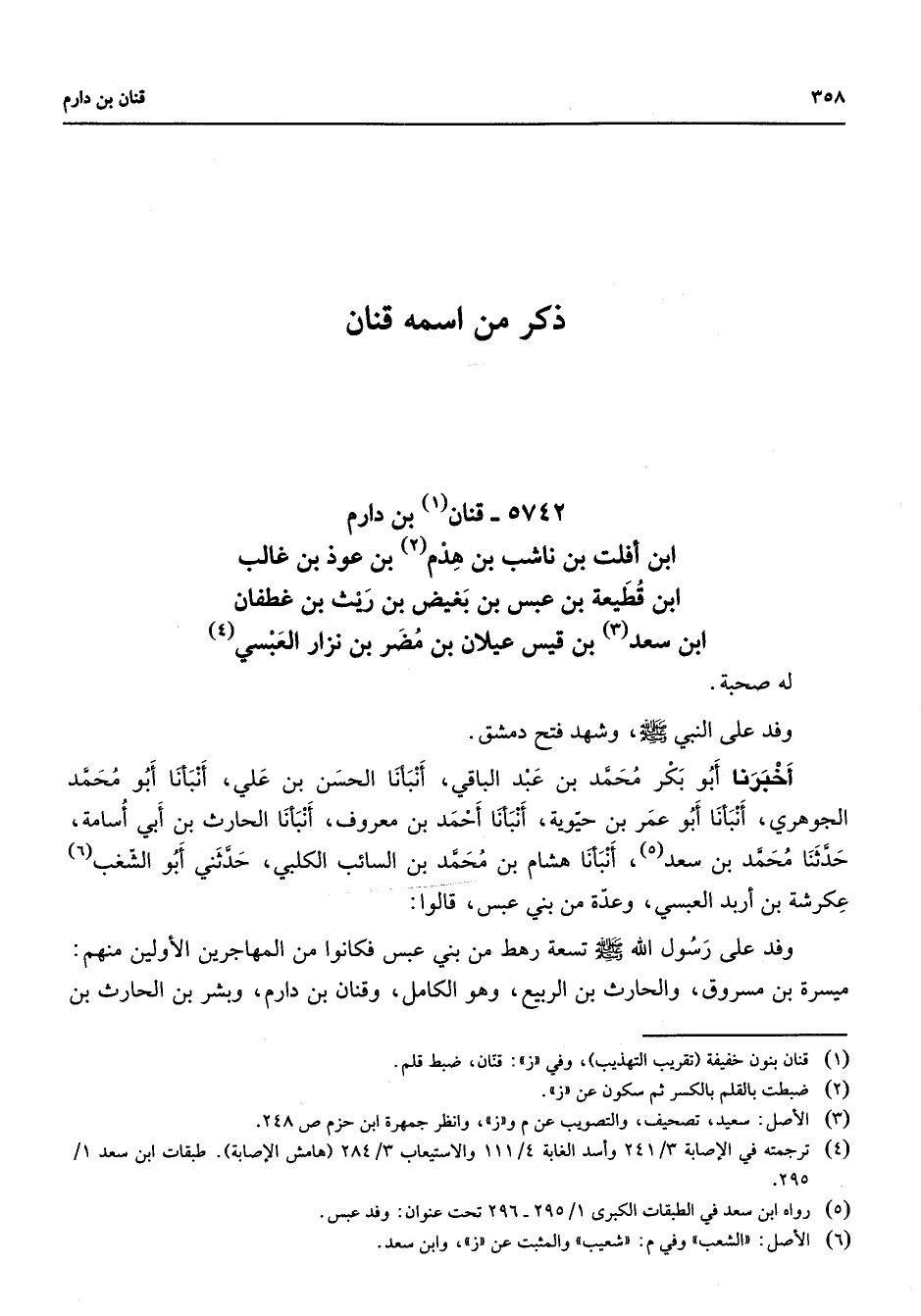 5742 - قنان (1) بن دارم ابن أفلت بن ناشب بن هدم (2) بن عوذ بن غالب ابن قطيعة بن عبس بن بغيض بن ريث بن غطفان ابن سعد (3) بن قيس عيلان بن مضر بن نزار العبسي (4) له صحبة وفد على النبي (صلى الله عليه وسلم) وشهد فتح دمشق أخبرنا أبو بكر محمد بن عبد الباقي أنبأنا الحسن بن علي أنبأنا أبو محمد الجوهري أنبأنا أبو عمر بن حيوية أنبأنا أحمد بن معروف أنبأنا الحارث بن أبي أسامة حدثنا محمد بن سعد (5) أنبأنا هشام بن محمد بن السائب الكلبي حدثني أبو الشغب عكرشة بن أربد العبسي وعدة من بني عبس قالوا وفد على رسول الله (صلى الله عليه وسلم) تسعة رهط من بني عبس فكانوا من المهاجرين الأولين منهم ميسرة بن مسروق والحارث بن الربيع وهو الكامل وقنان بن دارم وبشر بن الحارث بن