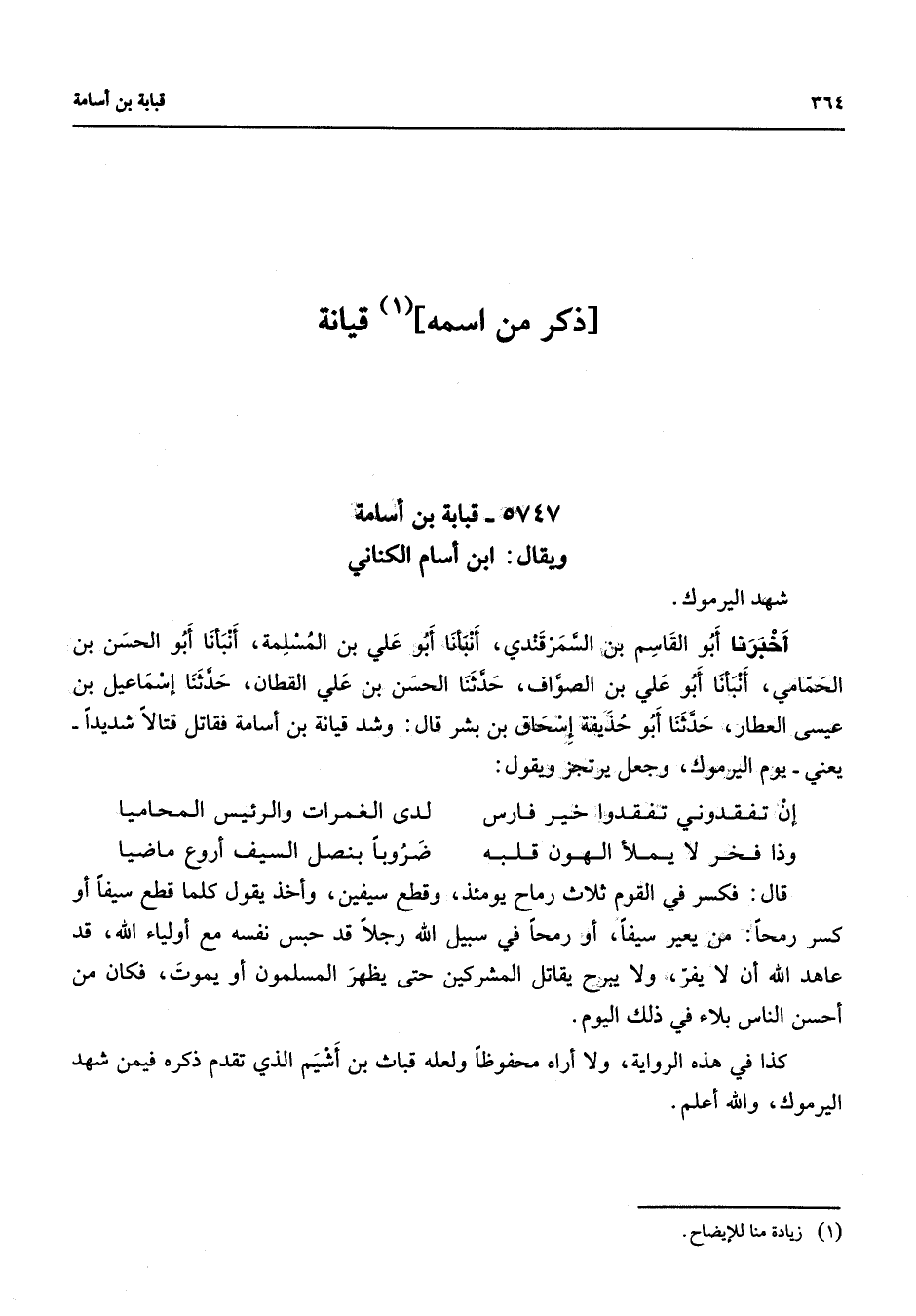 5747 - قبابة بن أسامة ويقال ابن أسام الكناني شهد اليرموك أخبرنا أبو القاسم بن السمرقندي أنبأنا أبو علي بن المسلمة أنبأنا أبو الحسن بن الحمامي أنبأنا أبو علي بن الصواف حدثنا الحسن بن علي القطان حدثنا إسماعيل بن عيسى العطار حدثنا أبو حذيفة إسحاق بن بشر قال وشد قيانة بن أسامة فقاتل قتالا شديدا يعني يوم اليرموك وجعل يرتجز ويقول * إن تفقدوني تفقدوا خير فارس * لدى الغمرات والرئيس المحاميا وذا فخر لا يملأ الهون قلبه * ضروبا بنصل السيف أروع ماضيا * قال فكسر في القوم ثلاث رماح يومئذ وقطع سيفين وأخذ يقول كلما قطع سيفا أو كسر رمحا من يعير سيفا أو رمحا في سبيل الله رجلا قد حبس نفسه مع أولياء الله قد عاهد الله أن لا يفر ولا يبرح يقاتل المشركين حتى يظهر المسلمون أو يموت فكان من أحسن الناس بلاء في ذلك اليوم كذا في هذه الرواية ولا أراه محفوظا ولعله قباث بن أشيم الذي تقدم ذكره فيمن شهد اليرموك والله أعلم