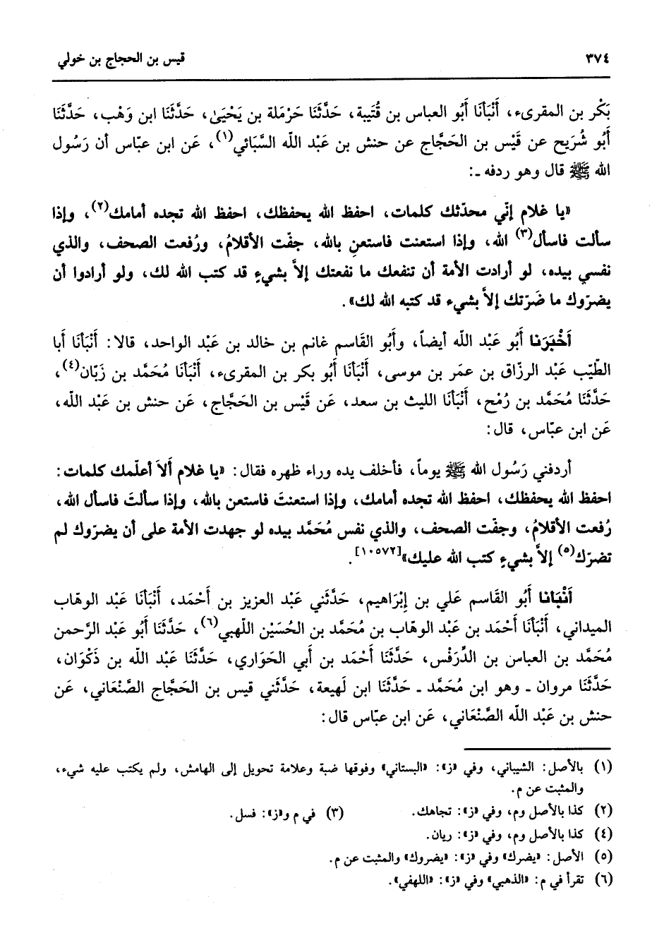 بكر بن المقرئ أنبأنا أبو العباس بن قتيبة حدثنا حرملة بن يحيى حدثنا ابن وهب حدثنا أبو شريح عن قيس بن الحجاج عن حنش بن عبد الله السبائي (1) عن ابن عباس أن رسول الله (صلى الله عليه وسلم) قال وهو ردفه يا غلام إني محدثك كلمات احفظ الله يحفظك احفظ الله تجده أمامك (2) وإذا سألت فاسأل (3) الله وإذا استعنت فاستعن بالله جفت الأقلام ورفعت الصحف والذي نفسي بيده لو أرادت الأمة أن تنفعك ما نفعتك إلا بشئ قد كتب الله لك ولو أرادوا أن يضروك ما ضرتك إلا بشئ قد كتبه الله لك أخبرنا أبو عبد الله أيضا وأبو القاسم غانم بن خالد بن عبد الواحد قالا أنبأنا أبا الطيب عبد الرزاق بن عمر بن موسى أنبأنا أبو بكر بن المقرئ أنبأنا محمد بن زبان (4) حدثنا محمد بن رمح أنبأنا الليث بن سعد عن قيس بن الحجاج عن حنش بن عبد الله عن ابن عباس قال أردفني رسول الله (صلى الله عليه وسلم) يوما فأخلف يده وراء ظهره فقال يا غلام ألا أعلمك كلمات احفظ الله يحفظك احفظ الله تجده أمامك وإذا استعنت فاستعن بالله وإذا سألت فاسأل الله رفعت الأقلام وجفت الصحف والذي نفس محمد بيده لو جهدت الأمة على أن يضروك لم تضرك (5) إلا بشئ كتب الله عليك