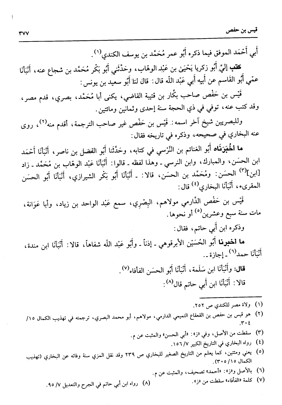 أبي أحمد الموفق فيما ذكره أبو عمر محمد بن يوسف الكندي (1) كتب إلي أبو زكريا يحيى بن عبد الوهاب وحدثني أبو بكر محمد بن شجاع عنه أنبأنا عمي أبو القاسم عن أبيه أبي عبد الله قال قال لنا أبو سعيد بن يونس قيس بن حفص صاحب بكار بن قتيبة القاضي يكنى أبا محمد بصري قدم مصر وقد كتب عنه توفي في ذي الحجة سنة إحدى وثمانين ومائتين وللبصريين شيخ آخر اسمه قيس بن حفص غير صاحب الترجمة أقدم منه (2) روى عنه البخاري في صحيحه وذكره في تاريخه فقال ما أخبرناه أبو الغنائم بن النرسي في كتابه وحدثنا أبو الفضل بن ناصر أنبأنا أحمد ابن الحسن والمبارك بن النرسي وهذا لفظه قالوا أنبأنا عبد الوهاب بن محمد زاد ابن (3) الحسن ومحمد بن الحسن قالا أنبأنا أبو بكر الشيرازي أنبأنا أبو الحسن المقرئ أنبأنا البخاري (4) قال قيس بن حفص الدارمي مولاهم البصري سمع عبد الواحد بن زياد وأبا عوانة مات سنة سبع وعشرين (5) أو نحوها وذكره ابن أبي حاتم فقال ما أخبرنا أبو الحسين الأبرقوهي إذنا وأبو عبد الله شفاها قالا أنبأنا ابن مندة أنبأنا حمد (6) إجازة قال وأنبأنا ابن سلمة أنبأنا أبو الحسن الفأفاء (7) قالا أنبأنا ابن أبي حاتم قال (8)