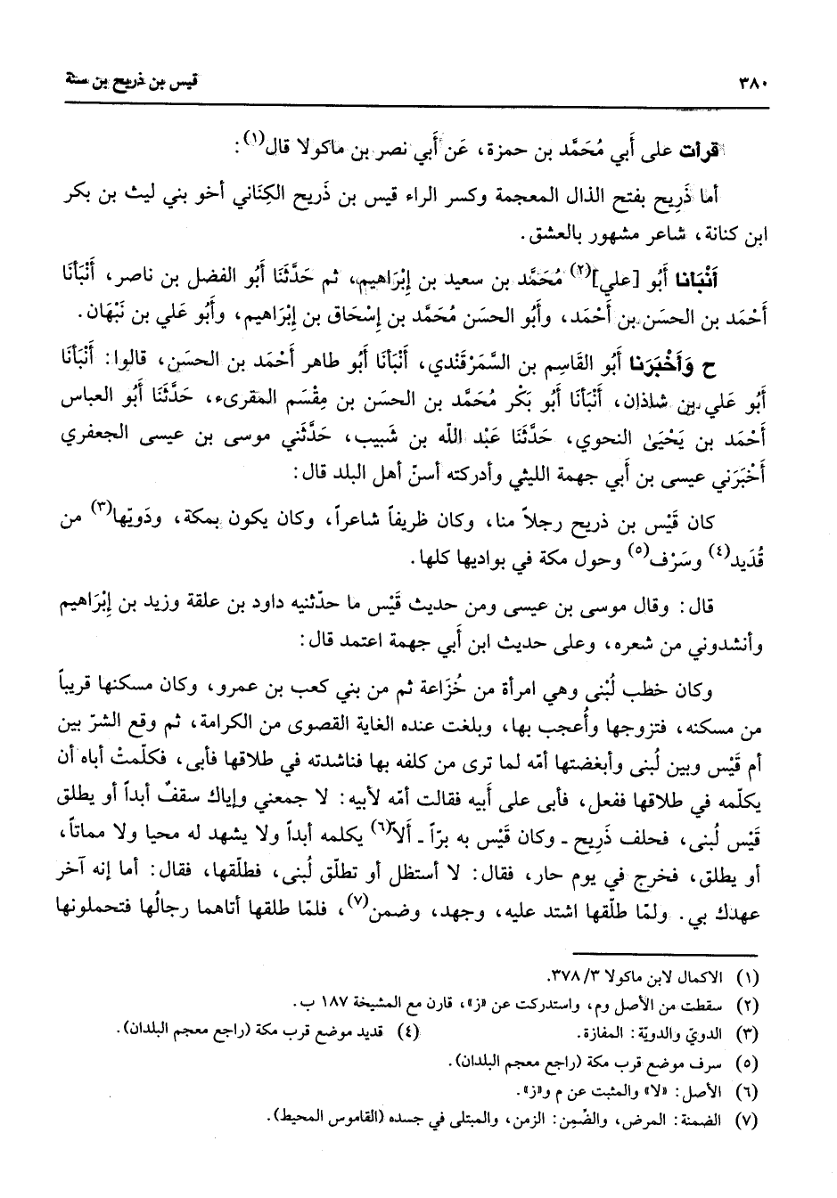 قرأت على أبي محمد بن حمزة عن أبي نصر بن ماكولا قال (1) أما ذريح بفتح الذال المعجمة وكسر الراء قيس بن ذريح الكناني أخو بني ليث بن بكر ابن كنانة شاعر مشهور بالعشق أنبأنا أبو علي (2) محمد بن سعيد بن إبراهيم ثم حدثنا أبو الفضل بن ناصر أنبأنا أحمد بن الحسن بن أحمد وأبو الحسن محمد بن إسحاق بن إبراهيم وأبو علي بن نبهان وأخبرنا أبو القاسم بن السمرقندي أنبأنا أبو طاهر أحمد بن الحسن قالوا أنبأنا أبو علي بن شاذان أنبأنا أبو بكر محمد بن الحسن بن مقسم المقرئ حدثنا أبو العباس أحمد بن يحيى النحوي حدثنا عبد الله بن شبيب حدثني موسى بن عيسى الجعفري أخبرني عيسى بن أبي جهمة الليثي وأدركته أسن أهل البلد قال كان قيس بن ذريح رجلا منا وكان ظريفا شاعرا وكان يكون بمكة ودويها (3) من قديد (4) وسرف (5) وحول مكة في بواديها كلها قال وقال موسى بن عيسى ومن حديث قيس ما حدثنيه داود بن علقة وزيد بن إبراهيم وأنشدوني من شعره وعلى حديث ابن أبي جهمة اعتمد قال وكان خطب لبنى وهي امرأة من خزاعة ثم من بني كعب بن عمرو وكان مسكنها قريبا من مسكنه فتزوجها وأعجب بها وبلغت عنده الغاية القصوى من الكرامة ثم وقع الشر بين أم قيس وبين لبنى وأبغضتها أمه لما ترى من كلفه بها فناشدته في طلاقها فأبى فكلمت أباه أن يكلمه في طلاقها ففعل فأبى على أبيه فقالت أمه لأبيه لا جمعني وإياك سقف أبدا أو يطلق قيس لبنى فحلف ذريح وكان قيس به برا ألا (6) يكلمه أبدا ولا يشهد له محيا ولا مماتا أو يطلق فخرج في يوم حار فقال لا أستظل أو تطلق لبنى فطلقها فقال أما إنه آخر عهدك بي ولما طلقها اشتد عليه وجهد وضمن (7) فلما طلقها أتاهما رجالها فتحملونها