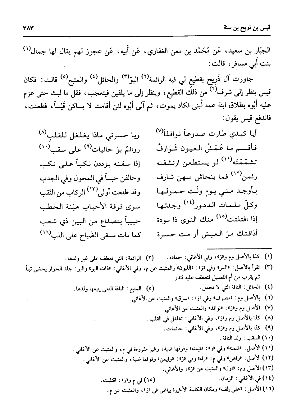 الجبار بن سعيد عن محمد بن معن الغفاري عن أبيه عن عجوز لهم يقال لها جمال (1) بنت أبي مسافر قالت جاورت آل ذريح بقطيع لي فيه الرائمة (2) البو (3) والحائل (4) والمتبع (5) قالت فكان قيس ينظر إلى شرف (6) من ذلك القطيع وينظر إلى ما يلقين فيتعجب فقل ما لبث حتى عزم عليه أبوه بطلاق ابنة عمه لبنى فكاد يموت ثم آلى أبوه لئن أقامت لا يساكن قيسا فظعنت فاندفع قيس يقول * أيا كبدي طارت صدوعا نوافذا (7) * ويا حسرتي ماذا يغلغل للقلب (8) فأقسم ما عمش العيون شوارف * روائم بو حائيات (9) على سقب (10) تشممنه (11) لو يستطعن ارتشفنه * إذا سفنه يزددن نكبا على نكب رئمن (12) فما ينحاش منهن شارف * وحالفن حبسا في المحول وفي الجدب بأوجد مني يوم ولت حمولها * وقد طلعت أولى (13) الركاب من النقب وكل ملمات الدهور (14) وجدتها * سوى فرقة الأحباب هينة الخطب إذا افتلتت (15) منك النوى ذا مودة * حبيبا بتصداع من البين ذي شعب أذاقتك مر العيش أو مت حسرة * كما مات مسقى الضياح على اللب * (16)