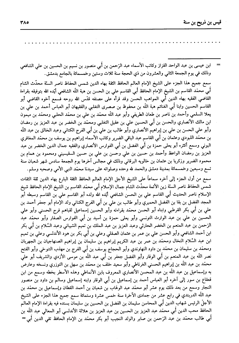 - ابن عيسى بن عبد الواحد القزاز وكاتب الاسماء عبد الرحمن بن أبي منصور بن أبي منصور بن نسيم بن الحسين بن علي الشافعي وذلك في يوم الجمعة الثاني والعشرون من ذي الحجة سنة ثلاث وستين وخمسمائة بالجامع بدمشق