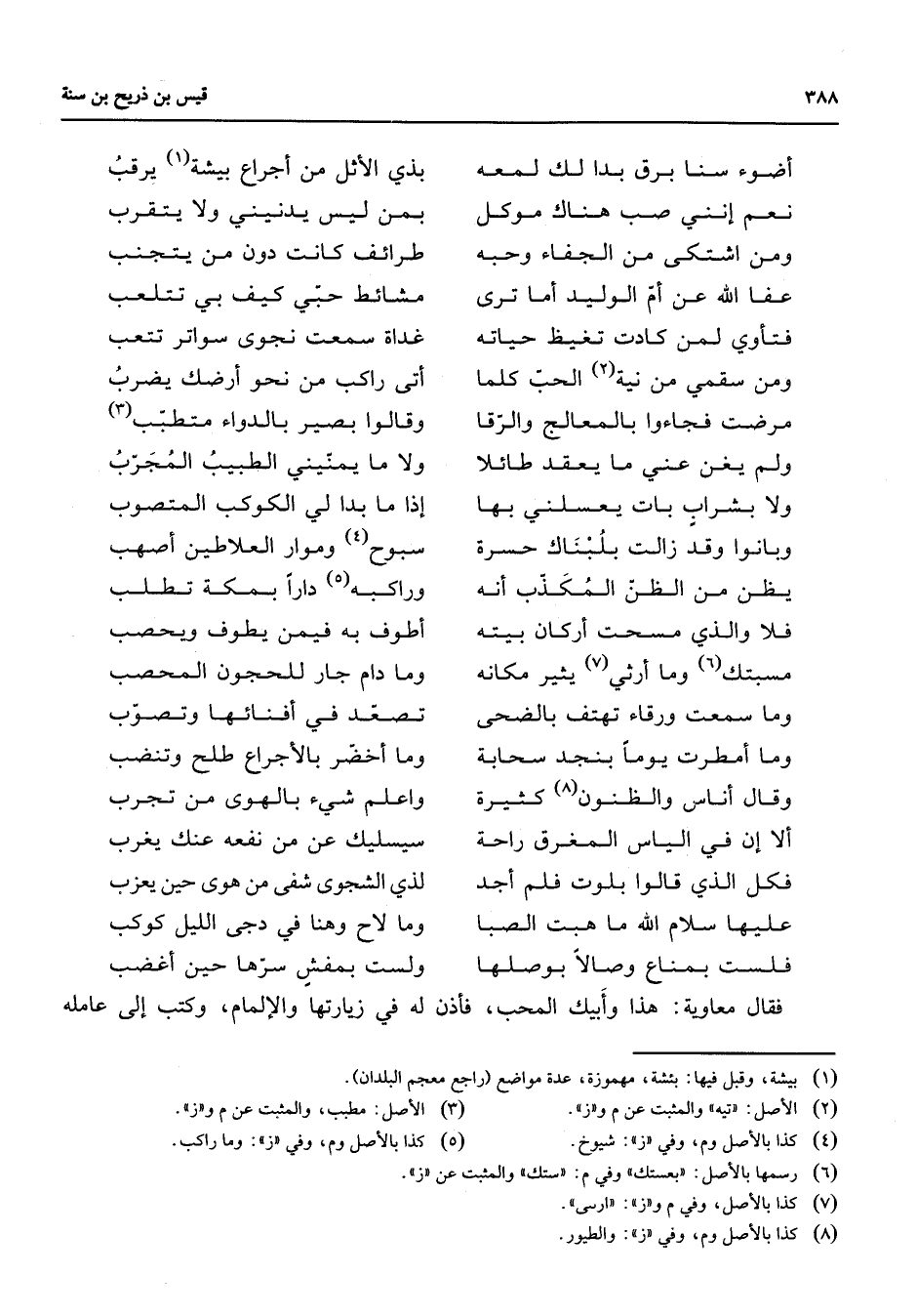 * أضوء سنا برق بدا لك لمعه * بذي الأثل من أجراع بيشة (1) يرقب نعم إنني صب هناك موكل * بمن ليس يدنيني ولا يتقرب ومن اشتكى من الجفاء وحبه * طرائف كانت دون من يتجنب عفا الله عن أم الوليد أما ترى * مشائط حبي كيف بي تتلعب فتأوي لمن كادت تغيظ حياته * غداة سمعت نجوى سواتر تتعب ومن سقمي من نية (2) الحب كلما * أتى راكب من نحو أرضك يضرب مرضت فجاءوا بالمعالج والرقا * وقالوا بصير بالدواء متطبب (3) ولم يغن عني ما يعقد طائلا * ولا ما يمنيني الطبيب المجرب ولا بشراب بات يعسلني بها * إذا ما بدا لي الكوكب المتصوب وبانوا وقد زالت بلبناك حسرة * سبوح (4) وموار العلاطين أصهب يظن من الظن المكذب أنه * وراكبه (5) دارا بمكة تطلب فلا والذي مسحت أركان بيته * أطوف به فيمن يطوف ويحصب مسبتك (6) وما أرثي (7) يثير مكانه * وما دام جار للحجون المحصب وما سمعت ورقاء تهتف بالضحى * تصعد في أفنائها وتصوب وما أمطرت يوما بنجد سحابة * وما أخضر بالأجراع طلح وتنضب وقال أناس والظنون (8) كثيرة * واعلم شئ بالهوى من تجرب ألا إن في الياس المغرق راحة * سيسليك عن من نفعه عنك يغرب فكل الذي قالوا بلوت فلم أجد * لذي الشجوى شفى من هوى حين يعزب عليها سلام الله ما هبت الصبا * وما لاح وهنا في دجى الليل كوكب فلست بمناع وصالا بوصلها * ولست بمفش سرها حين أغضب * فقال معاوية هذا وأبيك المحب فأذن له في زيارتها والإلمام وكتب إلى عامله
