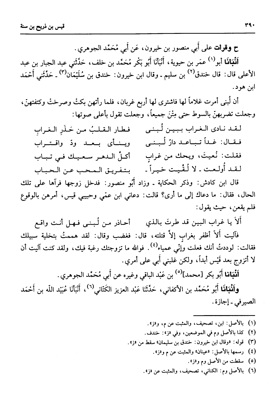 وقرأت على أبي منصور بن خيرون عن أبي محمد الجوهري أنبأنا أبو (1) عمر بن حيوية أنبأنا أبو بكر محمد بن خلف حدثني عبد الجبار بن عبد الأعلى قال قال خندق (2) بن سليم وقال ابن خيرون خندق بن سليمان (3) حدثني أحمد ابن هود أن لبنى أمرت غلاما لها فاشترى لها أربع غربان فلما رأتهن بكت وصرخت وكتفتهن وجعلت تضربهن بالسوط حتى متن جميعا وجعلت تقول بأعلى صوتها * لقد نادى الغراب ببين لبنى * فطار القلب من حذر الغراب فقال غدا تباعد دار لبنى * وينأى بعد ود واقتراب فقلت نعيت ويحك من غراب * أكل الدهر سعيك في تباب لقد أولعت لا لقيت خيرا * بتفريق المحب عن الحباب * قال ابن كادش وذكر الحكاية وزاد أبو منصور فدخل زوجها فرآها على تلك الحال فقال ما دعاك إلى ما أرى قالت دعاني ابن عمي وحبيبي قيس أمرهن بالوقوع فلم يقعن حيث يقول * ألا يا غراب البين قد طرت بالذي * أحاذر من لبنى فهل أنت واقع * فآليت ألا أظفر بغراب إلا قتلته قال فغضب وقال لقد هممت بتخلية سبيلك فقالت لوددت أنك فعلت وإني عمياء (4) فوالله ما تزوجتك رغبة فيك ولقد كنت آليت أن لا أتزوج بعد قيس أبدا ولكن غلبني أبي على أمري أنبأنا أبو بكر محمد (5) بن عبد الباقي وغيره عن أبي محمد الجوهري وأنبأنا أبو محمد بن الأكفاني حدثنا عبد العزيز الكتاني (6) أنبأنا عبيد الله بن أحمد الصيرفي إجازة