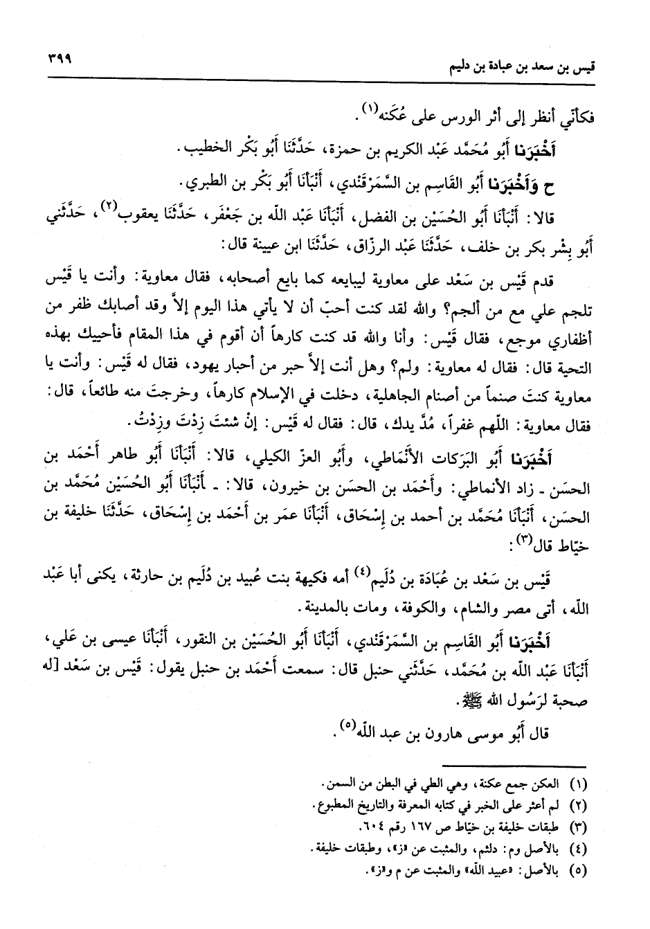 فكأني أنظر إلى أثر الورس على عكنه (1) أخبرنا أبو محمد عبد الكريم بن حمزة حدثنا أبو بكر الخطيب وأخبرنا أبو القاسم بن السمرقندي أنبأنا أبو بكر بن الطبري قالا أنبأنا أبو الحسين بن الفضل أنبأنا عبد الله بن جعفر حدثنا يعقوب (2) حدثني أبو بشر بن بكر بن خلف حدثنا عبد الرزاق حدثنا ابن عيينة قال قدم قيس بن سعد على معاوية ليبايعه كما بايع أصحابه فقال معاوية وأنت يا قيس تلجم علي مع من ألجم والله لقد كنت أحب أن لا يأتي هذا اليوم إلا وقد أصابك ظفر من أظفاري موجع فقال قيس وأنا والله قد كنت كارها أن أقوم في هذا المقام فأحييك بهذه التحية قال فقال له معاوية ولم وهل أنت إلا حبر من أحبار يهود فقال له قيس وأنت يا معاوية كنت صنما من أصنام الجاهلية دخلت في الإسلام كارها وخرجت منه طائعا قال فقال معاوية اللهم غفرا مد يدك قال فقال له قيس إن شئت زدت وزدت أخبرنا أبو البركات الأنماطي وأبو العز الكيلي قالا أنبأنا أبو طاهر أحمد بن الحسن زاد الأنماطي وأحمد بن الحسن بن خيرون قالا أنبأنا أبو الحسين محمد بن الحسن أنبأنا محمد بن أحمد بن إسحاق أنبأنا عمر بن أحمد بن إسحاق حدثنا خليفة بن خياط قال (3) قيس بن سعد بن عبادة بن دليم (4) أمه فكيهة بنت عبيد بن دليم بن حارثة يكنى أبا عبد الله أتى مصر والشام والكوفة ومات بالمدينة أخبرنا أبو القاسم بن السمرقندي أنبأنا أبو الحسين بن النقور أنبأنا عيسى بن علي أنبأنا عبد الله بن محمد حدثني حنبل قال سمعت أحمد بن حنبل يقول قيس بن سعد له صحبة لرسول الله (صلى الله عليه وسلم) قال أبو موسى هارون بن عبد الله (5)