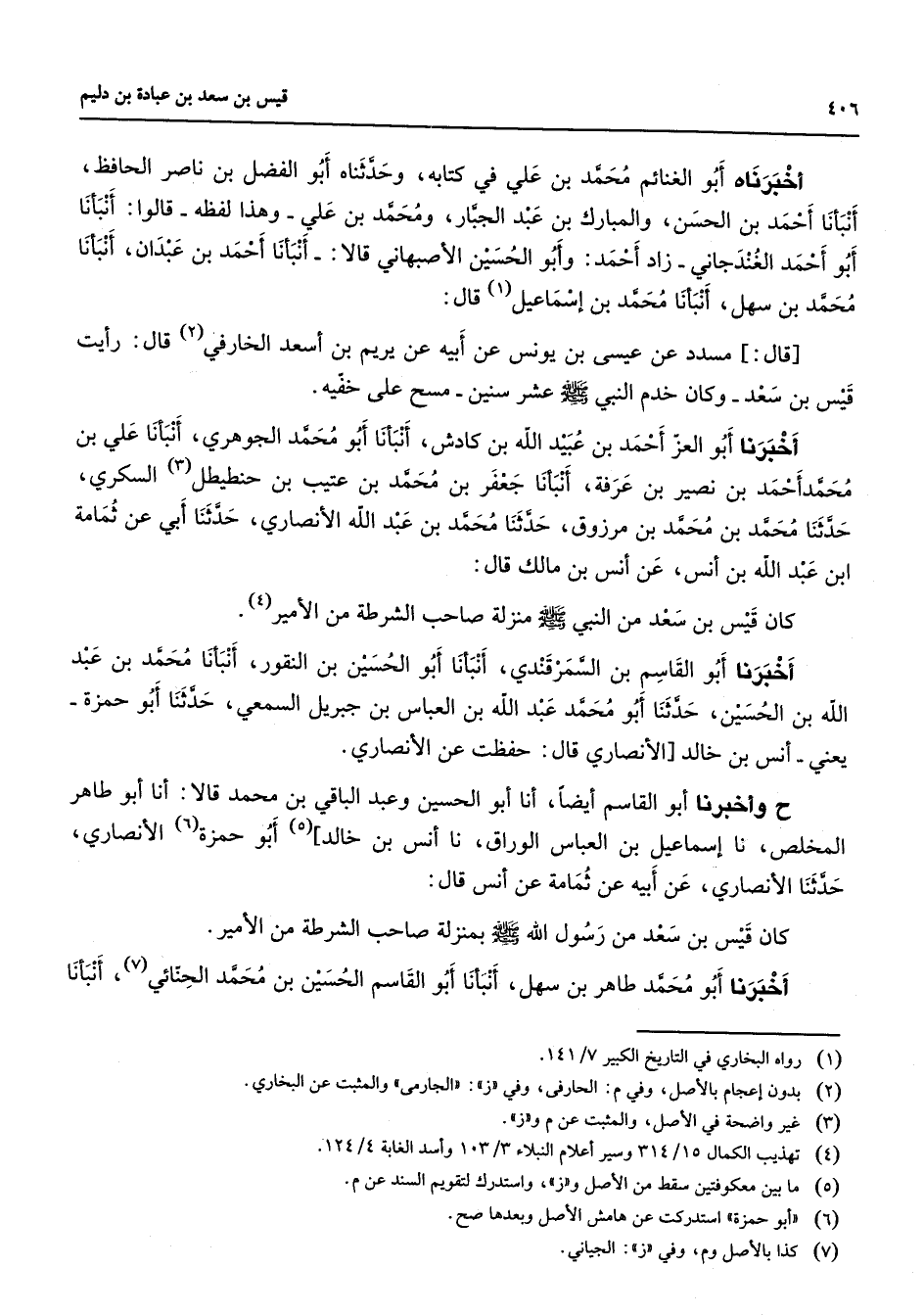أخبرناه أبو الغنائم محمد بن علي في كتابه وحدثناه أبو الفضل بن ناصر الحافظ أنبأنا أحمد بن الحسن والمبارك بن عبد الجبار ومحمد بن علي وهذا لفظه قالوا أنبأنا أبو أحمد الغندجاني زاد أحمد وأبو الحسين الأصبهاني قالا أنبأنا أحمد بن عبدان أنبأنا محمد بن سهل أنبأنا محمد بن إسماعيل (1) قال قال مسدد عن عيسى بن يونس عن أبيه عن يريم بن أسعد الخارفي (2) قال رأيت قيس بن سعد وكان خدم النبي (صلى الله عليه وسلم) عشر سنين مسح على خفيه أخبرنا أبو العز أحمد بن عبيد الله بن كادش أنبأنا أبو محمد الجوهري أنبأنا علي بن محمد أحمد بن نصير بن عرفة أنبأنا جعفر بن محمد بن عتيب بن حنطيطل (3) السكري حدثنا محمد بن محمد بن مرزوق حدثنا محمد بن عبد الله الأنصاري حدثنا أبي عن ثمامة ابن عبد الله بن أنس عن أنس بن مالك قال كان قيس بن سعد من النبي (صلى الله عليه وسلم) منزلة صاحب الشرطة من الأمير (4) أخبرنا أبو القاسم بن السمرقندي أنبأنا أبو الحسين بن النقور أنبأنا محمد بن عبد الله بن الحسين حدثنا أبو محمد عبد الله بن العباس بن جبريل السمعي حدثنا أبو حمزة يعني أنس بن خالد الأنصاري قال حفظت عن الأنصاري وأخبرنا أبو القاسم أيضا أنا أبو الحسين وعبد الباقي بن محمد قالا أنا أبو طاهر المخلص نا إسماعيل بن العباس الوراق نا أنس بن خالد (5) أبو حمزة (6) الأنصاري حدثنا الأنصاري عن أبيه عن ثمامة عن أنس قال كان قيس بن سعد من رسول الله (صلى الله عليه وسلم) بمنزلة صاحب الشرطة من الأمير أخبرنا أبو محمد طاهر بن سهل أنبأنا أبو القاسم الحسين بن محمد الحنائي (7) أنبأنا