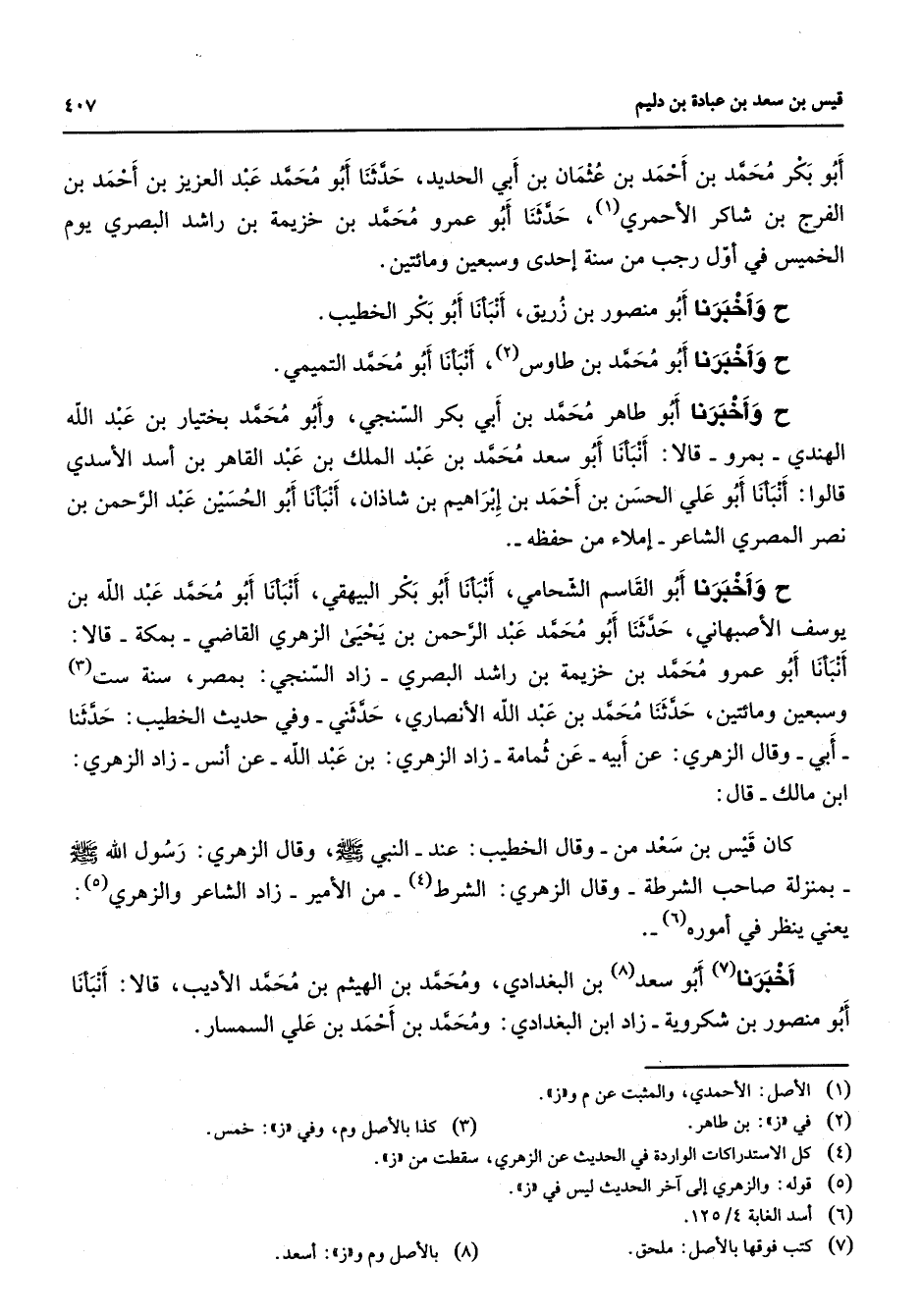 أبو بكر محمد بن أحمد بن عثمان بن أبي الحديد حدثنا أبو محمد عبد العزيز بن أحمد بن الفرج بن شاكر الأحمري (1) حدثنا أبو عمرو محمد بن خزيمة بن راشد البصري يوم الخميس في أول رجب من سنة إحدى وسبعين ومائتين وأخبرنا أبو منصور بن زريق أنبأنا أبو بكر الخطيب وأخبرنا أبو محمد بن طاوس (2) أنبأنا أبو محمد التميمي وأخبرنا أبو طاهر محمد بن أبي بكر السنجي وأبو محمد بختيار بن عبد الله الهندي بمرو قالا أنبأنا أبو سعد محمد بن عبد الملك بن عبد القاهر بن أسد الأسدي قالوا أنبأنا أبو علي الحسن بن أحمد بن إبراهيم بن شاذان أنبأنا أبو الحسين عبد الرحمن بن نصر المصري الشاعر إملاء من حفظه وأخبرنا أبو القاسم الشحامي أنبأنا أبو بكر البيهقي أنبأنا أبو محمد عبد الله بن يوسف الأصبهاني حدثنا أبو محمد عبد الرحمن بن يحيى الزهري القاضي بمكة قالا أنبأنا أبو عمرو محمد بن خزيمة بن راشد البصري زاد السنجي بمصر سنة ست (3) وسبعين ومائتين حدثنا محمد بن عبد الله الأنصاري حدثني وفي حديث الخطيب حدثنا أبي وقال الزهري عن أبيه عن ثمامة زاد الزهري بن عبد الله عن أنس زاد الزهري ابن مالك قال كان قيس بن سعد من وقال الخطيب عند النبي (صلى الله عليه وسلم) وقال الزهري رسول الله (صلى الله عليه وسلم) بمنزلة صاحب الشرطة (4) وقال الزهري الشرط من الأمير زاد الشاعر والزهري (5) يعني ينظر في أموره (6) أخبرنا (7) أبو سعد (8) بن البغدادي ومحمد بن الهيثم بن محمد الأديب قالا أنبأنا أبو منصور بن شكروية زاد ابن البغدادي ومحمد بن أحمد بن علي السمسار