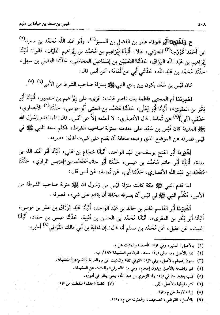 وأخبرنا أبو الوفاء عمر بن الفضل بن المميز (1) وأبو عبد الله محمد بن سعيد (2) ابن أحمد كورجة (3) الحرقي قالا أنبأنا إبراهيم بن محمد بن إبراهيم الطيان قالوا أنبأنا إبراهيم بن عبد الله الوراق حدثنا الحسين بن إسماعيل المحاملي حدثنا الفضل بن سهل حدثنا محمد بن عبد الله حدثني أبي عن ثمامة عن أنس قال كان قيس بن سعد يكون بين يدي النبي (صلى الله عليه وسلم) بمنزلة صاحب الشرطة من الأمير (4) (5) أخبرتنا أم المجتبى فاطمة بنت ناصر قالت قرئ على إبراهيم بن منصور أنبأنا أبو بكر بن المقرئ أنبأنا أبو يعلى حدثنا محمد بن المثنى أبو موسى حدثنا (6) الأنصاري حدثني أبي (7) عن ثمامة قال الأنصاري لا أعلمه إلا عن أنس قال لما قدم رسول الله (صلى الله عليه وسلم) المدينة كان قيس بن سعد على مقدمته بمنزلة صاحب الشرطة فكلم سعد النبي (صلى الله عليه وسلم) في قيس فصرفه عن الموضع الذي وضعه مخافة أن يقدم على شئ قال فصرفه أخبرنا أبو الفتح يوسف بن عبد الواحد أنبأنا شجاع بن علي أنبأنا أبو عبد الله بن مندة أنبأنا أبو حاتم محمد بن عيسى حدثنا أبو حاتم محمد بن إدريس الرازي حدثنا محمد بن عبد الله الأنصاري حدثنا أبي عن ثمامة عن أنس قال لما قدم النبي (صلى الله عليه وسلم) مكة كانت منزلة قيس من رسول الله (صلى الله عليه وسلم) منزلة صاحب الشرطة من الأمير فكلم النبي (صلى الله عليه وسلم) في قيس أن يصرفه مخافة أن يقدم على شئ فصرفه أخبرنا أبو القاسم غانم بن خالد بن عبد الواحد أنبأنا عبد الرزاق بن عمر بن موسى أنبأنا أبو بكر بن المقرئ أنبأنا محمد بن الحسن بن قتيبة حدثنا عيسى بن حماد أنبأنا الليث بن عقيل عن محمد بن مسلم أنه قال إن ثعلبة بن أبي مالك القرطي (8) أخبره