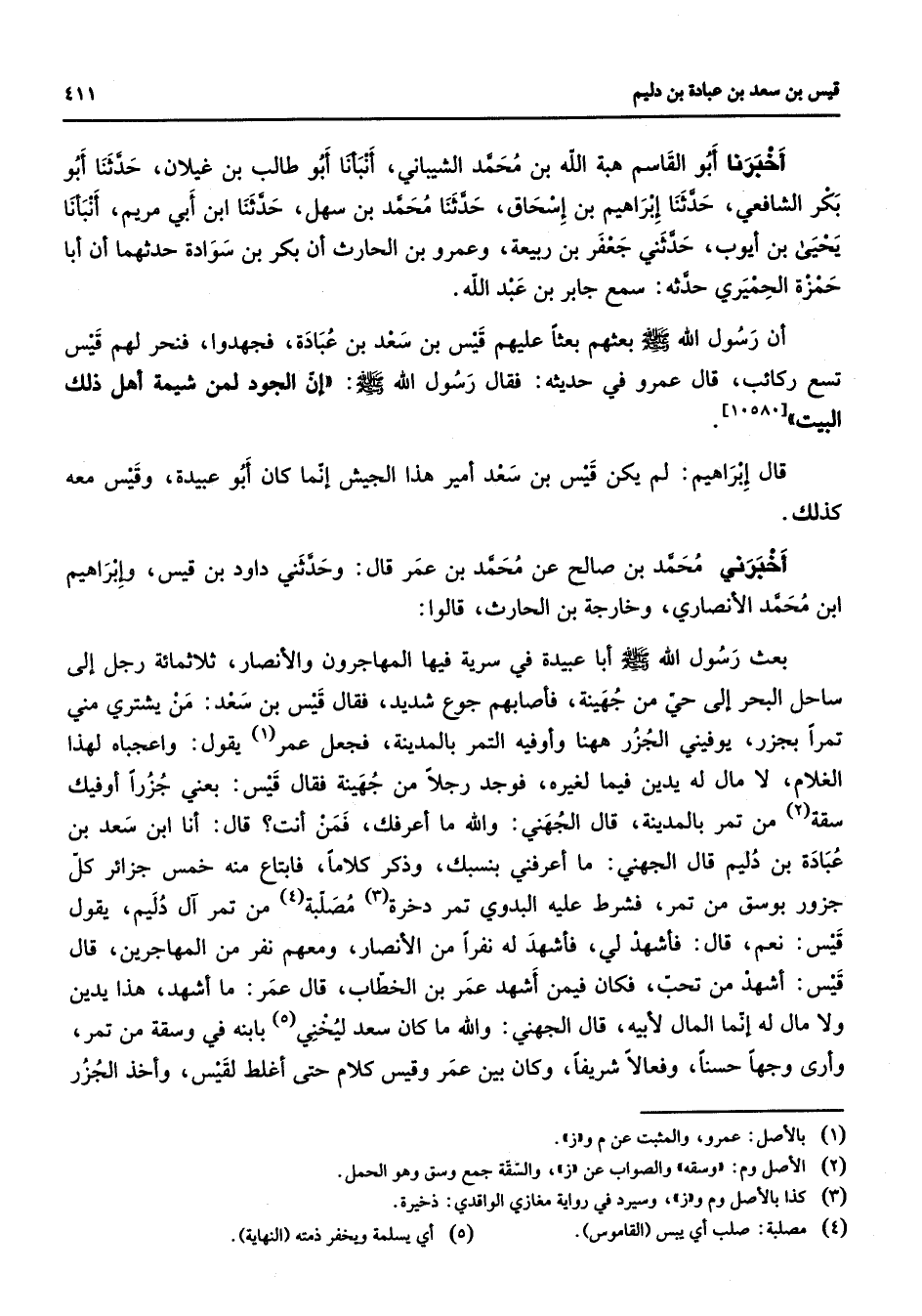 أخبرنا أبو القاسم هبة الله بن محمد الشيباني أنبأنا أبو طالب بن غيلان حدثنا أبو بكر الشافعي حدثنا إبراهيم بن إسحاق حدثنا محمد بن سهل حدثنا ابن أبي مريم أنبأنا يحيى بن أيوب حدثني جعفر بن ربيعة وعمرو بن الحارث أن بكر بن سوادة حدثهما أن أبا حمزة الحميري حدثه سمع جابر بن عبد الله أن رسول الله (صلى الله عليه وسلم) بعثهم بعثا عليهم قيس بن سعد بن عبادة فجهدوا فنحر لهم قيس تسع ركائب قال عمرو في حديثه فقال رسول الله (صلى الله عليه وسلم) إن الجود لمن شيمة أهل ذلك البيت