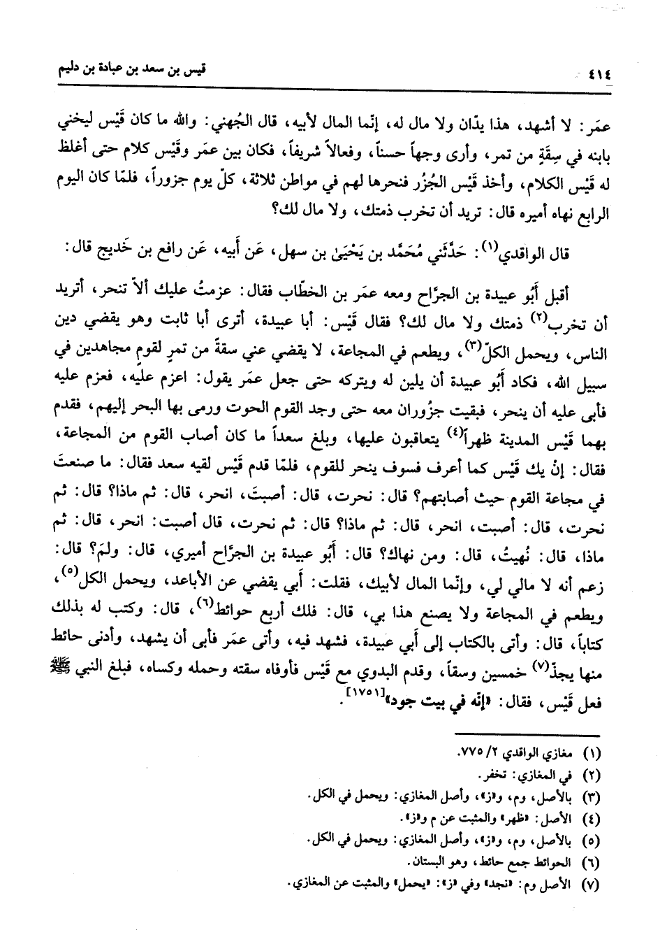 عمر لا أشهد هذا يدان ولا مال له إنما المال لأبيه قال الجهني والله ما كان قيس ليخني بابنه في سقة من تمر وأرى وجها حسنا وفعالا شريفا فكان بين عمر وقيس كلام حتى أغلظ له قيس الكلام وأخذ قيس الجزر فنحرها لهم في مواطن ثلاثة كل يوم جزورا فلما كان اليوم الرابع نهاه أميره قال تريد أن تخرب ذمتك ولا مال لك قال الواقدي (1) حدثني محمد بن يحيى بن سهل عن أبيه عن رافع بن خديج قال أقبل أبو عبيدة بن الجراح ومعه عمر بن الخطاب فقال عزمت عليك ألا تنحر أتريد أن تخرب (2) ذمتك ولا مال لك فقال قيس أبا عبيدة أترى أبا ثابت وهو يقضي دين الناس ويحمل الكل (3) ويطعم في المجاعة لا يقضي عني سقة من تمر لقوم مجاهدين في سبيل الله فكاد أبو عبيدة أن يلين له ويتركه حتى جعل عمر يقول اعزم عليه فعزم عليه فأبى عليه أن ينحر فبقيت جزوران معه حتى وجد القوم الحوت ورمى بها البحر إليهم فقدم بهما قيس المدينة ظهرا (4) يتعاقبون عليها وبلغ سعدا ما كان أصاب القوم من المجاعة فقال إن يك قيس كما أعرف فسوف ينحر للقوم فلما قدم قيس لقيه سعد فقال ما صنعت في مجاعة القوم حيث أصابتهم قال نحرت قال أصبت انحر قال ثم ماذا قال ثم نحرت قال أصبت انحر قال ثم ماذا قال ثم نحرت قال أصبت انحر قال ثم ماذا قال نهيت قال ومن نهاك قال أبو عبيدة بن الجراح أميري قال ولم قال زعم أنه لا مالي لي وإنما المال لأبيك فقلت أبي يقضي عن الأباعد ويحمل الكل (5) ويطعم في المجاعة ولا يصنع هذا بي قال فلك أربع حوائط (6) قال وكتب له بذلك كتابا قال وأتى بالكتاب إلى أبي عبيدة فشهد فيه وأتى عمر فأبى أن يشهد وأدنى حائط منها يجد (7) خمسين وسقا وقدم البدوي مع قيس فأوفاه سقته وحمله وكساه فبلغ النبي (صلى الله عليه وسلم) فعل قيس فقال إنه في بيت جود