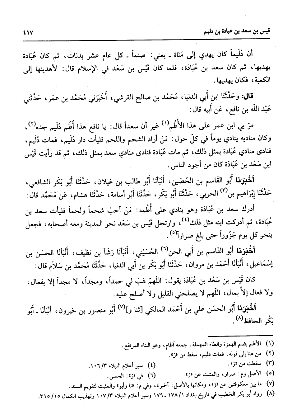 أن دليما كان يهدي إلى مناة يعني صنما كل عام عشر بدنات ثم كان عبادة يهديها ثم كان سعد بن عبادة فملا كان قيس بن سعد في الإسلام قال لأهدينها إلى الكعبة فكان يهديها قال وحدثنا ابن أبي الدنيا محمد بن صالح القرشي أخبرني محمد بن عمر حدثني عبد الله بن نافع عن أبيه قال مر بي ابن عمر على هذا الأطم (1) غير أن سعدا قال يا نافع هذا أطم دليم جده (2) وكان مناديه ينادي يوما في كل حول من اراد الشحم واللحم فليأت دار دليم فمات دليم فنادى منادي عبادة بمثل ذلك ثم مات عبادة فنادى منادي سعد بمثل ذلك ثم قد رأيت قيس ابن سعد بن عبادة كان من أجود الناس أخبرنا أبو القاسم بن الحصين أنبأنا أبو طالب بن غيلان حدثنا أبو بكر الشافعي حدثنا إبراهيم بن (3) الحربي حدثنا أبو بكر حدثنا أبو أسامة حدثنا هشام عن محمد قال أدرك سعد بن عبادة وهو ينادي على أطمه من أحب شحما ولحما فليأت سعد بن عبادة ثم أدركت ابنه مثل ذلك (4) وارتحل قيس بن سعد نحو المدينة ومعه أصحابه فجعل ينحر كل يوم جزورا حتى بلغ صرارا (5) أخبرنا أبو القاسم بن أبي الحن (6) الحسيني أنبأنا رشأ بن نظيف أنبأنا الحسن بن إسماعيل أنبأنا أحمد بن مروان حدثنا أبو بكر بن أبي الدنيا حدثنا محمد بن سلام قال كان قيس بن سعد بن عبادة يقول اللهم هب لي حمدا ومجدا لا مجدا إلا بفعال ولا فعال إلا بمال اللهم لا يصلحني القليل ولا اصلح عليه أخبرنا أبو الحسن علي بن أحمد المالكي ثنا و (7) أبو منصور بن خيرو أنبأنا أبو بكر الحافظ (8)