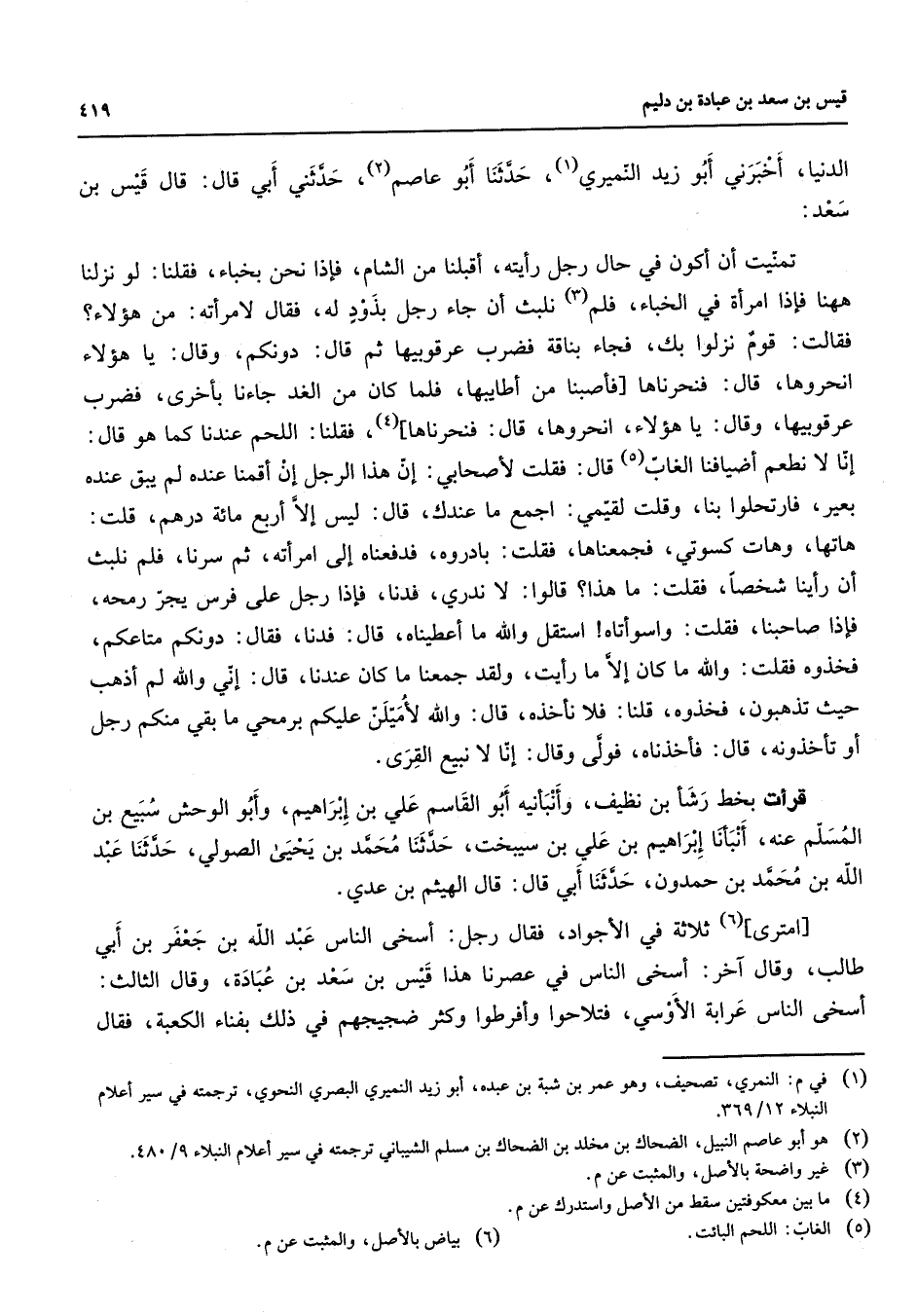 الدنيا أخبرني أبو زيد النميري (1) حدثنا أبو عاصم (2) حدثني أبي قال قال قيس بن سعد تمنيت أن أكون في حال رجل رأيته أقبلنا من الشام فإذا نحن بخباء فقلنا لو نزلنا ههنا فإذا امرأة في الخباء فلم (3) نلبث أن جاء رجل بذود له فقال لامرأته من هؤلاء فقالت قوم نزلوا بك فجاء بناقة فضرب عرقوبيها ثم قال دونكم وقال يا هؤلاء انحروها قال فنحرناها فأصبنا من أطايبها فلما كان من الغد جاءنا بأخرى فضرب عرقوبيها وقال يا هؤلاء انحروها قال فنحرناها (4) فقلنا اللحم عندنا كما هو قال إنا لا نطعم أضيافنا الغاب (5) قال فقلت لأصحابي إن هذا الرجل إن أقمنا عنده لم يبق عنده بعير فارتحلوا بنا وقلت لقيمي اجمع ما عندك قال ليس إلا أربع مائة درهم قلت هاتها وهات كسوتي فجمعناها فقلت بادروه فدفعناه إلى امرأته ثم سرنا فلم نلبث أن رأينا شخصا فقلت ما هذا قالوا لا ندري فدنا فإذا رجل على فرس يجر رمحه فإذا صاحبنا فقلت واسوأتاه استقل والله ما أعطيناه قال فدنا فقال دونكم متاعكم فخذوه فقلت والله ما كان إلا ما رأيت ولقد جمعنا ما كان عندنا قال إني والله لم أذهب حيث تذهبون فخذوه قلنا فلا نأخذه قال والله لأميلن عليكم برمحي ما بقي منكم رجل أو تأخذونه قال فأخذناه فولى وقال إنا لا نبيع القرى قرأت بخط رشأ بن نظيف وأنبأنيه أبو القاسم علي بن إبراهيم وأبو الوحش سبيع بن المسلم عنه أنبأنا إبراهيم بن علي بن سيبخت حدثنا محمد بن يحيى اح لصولي حدثنا عبد الله بن محمد بن حمدون حدثنا أبي قال قال الهيثم بن عدي امترى (6) ثلاثة في الأجواد فقال رجل أسخى الناس عبد الله بن جعفر بن أبي طالب وقال آخر أسخى الناس في عصرنا هذا قيس بن سعد بن عبادة وقال الثالث أسخى الناس عرابة الأوسي فتلاحوا وأفرطوا وكثر ضجيجهم في ذلك بفناء الكعبة فقال