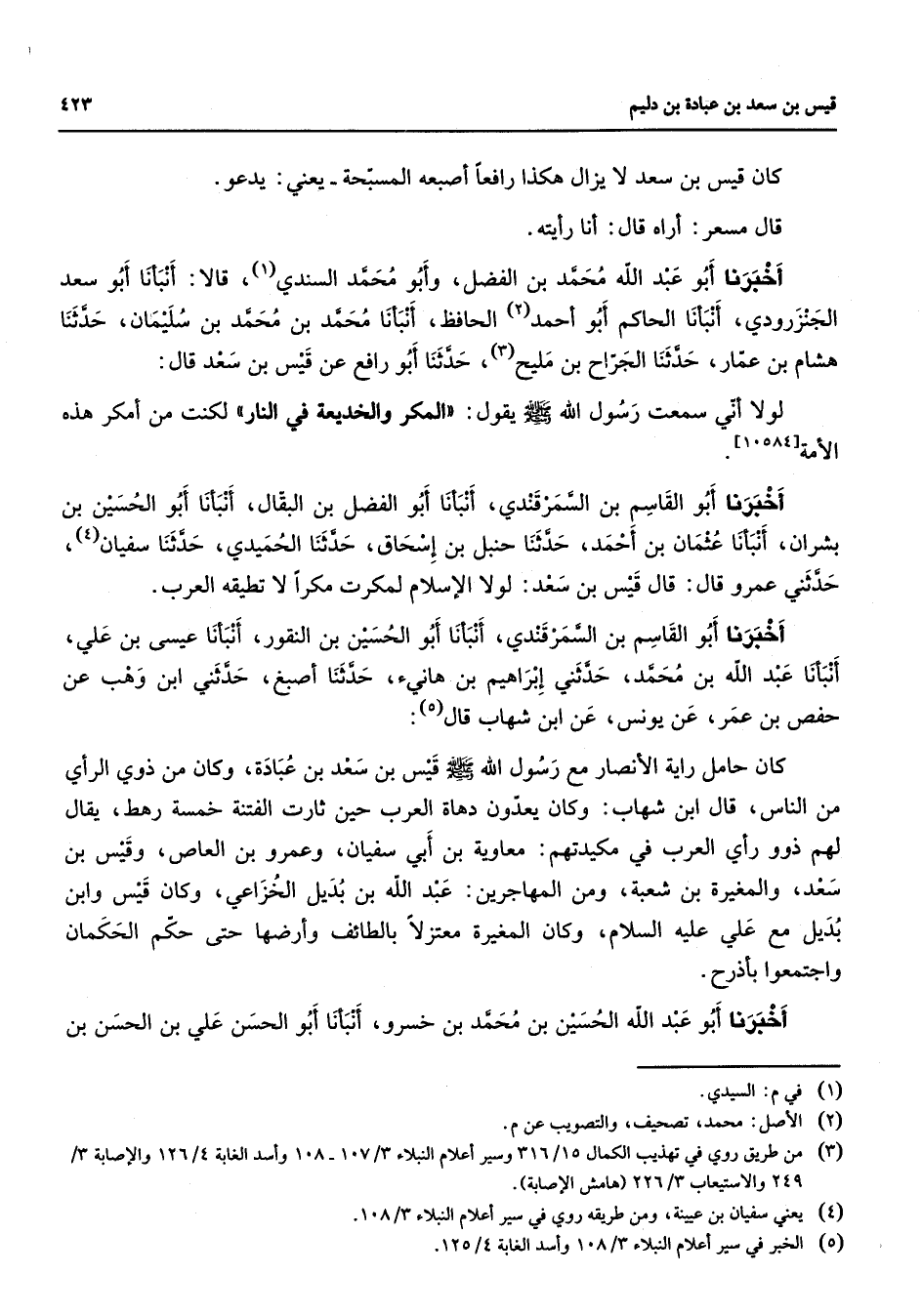 كان قيس بن سعد لا يزال هكذا رافعا أصبعه المسبحة يعني يدعو قال مسعر أراه قال أنا رأيته أخبرنا أبو عبد الله محمد بن الفضل وأبو محمد السندي (1) قالا أنبأنا أبو سعد الجنزرودي أنبأنا الحاكم أبو أحمد (2) الحافظ أنبأنا محمد بن محمد بن سليمان حدثنا هشام بن عمار حدثنا الجراح بن مليح (3) حدثنا أبو رافع عن قيس بن سعد قال لولا أني سمعت رسول الله (صلى الله عليه وسلم) يقول المكر والخديعة في النار لكنت من أمكر هذه الأمة