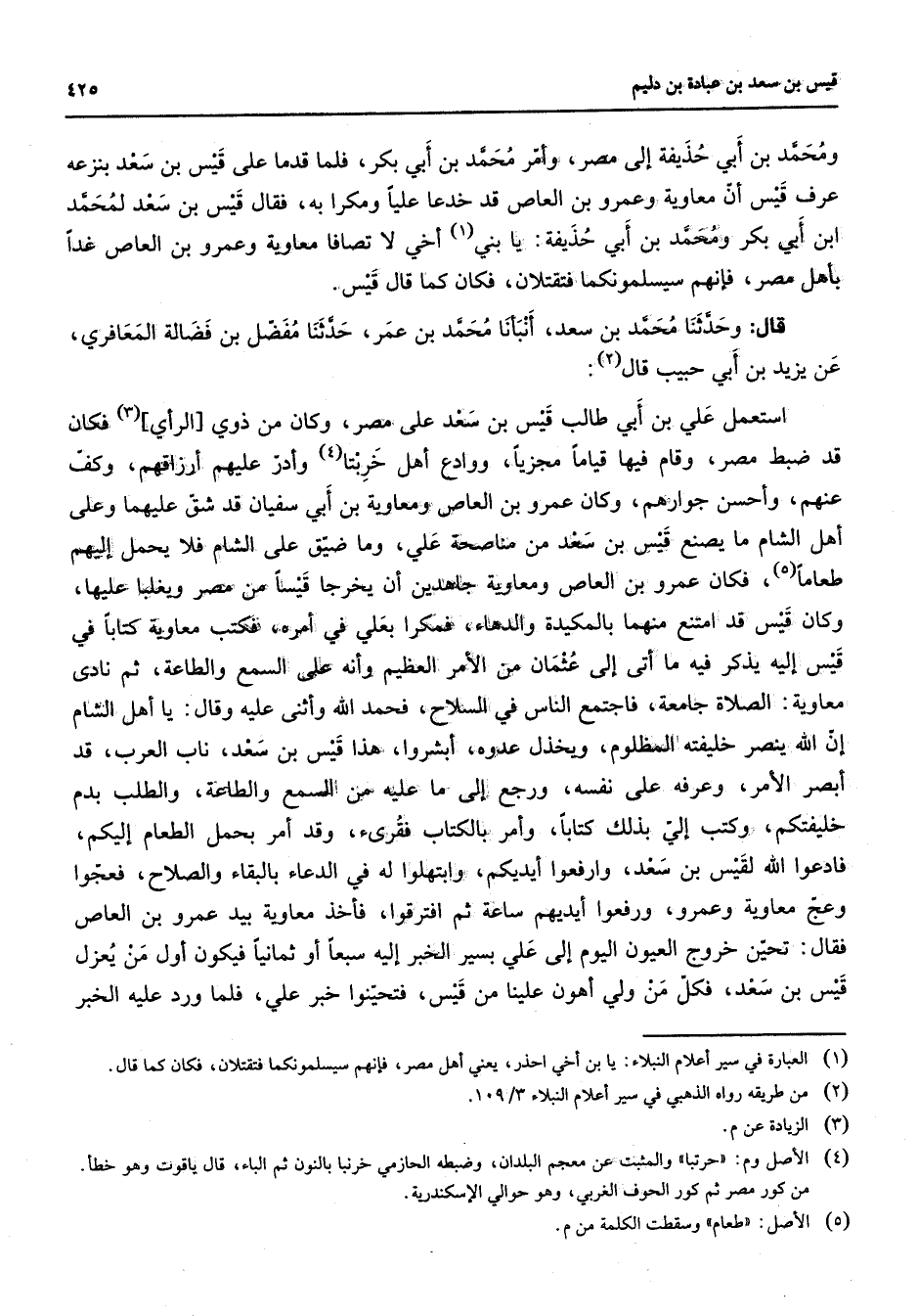 ومحمد بن أبي حذيفة إلى مصر وأمر محمد بن أبي بكر فلما قدما على قيس بن سعد بنزعه عرف قيس أن معاوية وعمرو بن العاص قد خدعا عليا ومكرا به فقال قيس بن سعد لمحمد بن أبي بكر ومحمد بن أبي حذيفة يا بني (1) أخي لا تصافا معاوية وعمرو بن العاص غدا بأهل مصر فإنهم سيسلمونكما فتقتلان فكان كما قال قيس قال وحدثنا محمد بن سعد أنبأنا محمد بن عمر حدثنا مفضل بن فضالة المعافري عن يزيد بن أبي حبيب قال (2) استعمل علي بن أبي طالب قيس بن سعد على مصر وكان من ذوي الرأي (3) فكان قد ضبط مصر وقام فيها قياما مجزيا ووادع أهل خربتا (4) وأدر عليهم أرزاقهم وكف عنهم وأحسن جوارهم وكان عمرو بن العاص ومعاوية بن أبي سفيان قد شق عليهما وعلى أهل الشام ما يصنع قيس بن سعد من مناصحة علي وما ضيق على الشام فلا يحمل إليهم طعاما (5) فكان عمرو بن العاص ومعاوية جاهدين أن يخرجا قيسا من مصر ويغلبا عليها وكان قيس قد امتنع منهما بالمكيدة والدهاء فمكرا بعلي في أمره فكتب معاوية كتابا في قيس إليه يذكر فيه ما أتى إلى عثمان من الأمر العظيم وأنه على السمع والطاعة ثم نادى معاوية الصلاة جامعة فاجتمع الناس في السلاح فحمد الله وأثنى عليه وقال يا أهل الشام إن الله ينصر خليفته المظلوم ويخذل عدوه أبشروا هذا قيس بن سعد ناب العرب قد أبصر الأمر وعرفه على نفسه ورجع إلى ما عليه من السمع والطاعة والطلب بدم خليفتكم وكتب إلي بذلك كتابا وأمر بالكتاب فقرئ وقد أمر بحمل الطعام إليكم فادعوا الله لقيس بن سعد وارفعوا أيديكم وابتهلوا له في الدعاء بالبقاء والصلاح فعجوا وعج معاوية وعمرو ورفعوا أيديهم ساعة ثم افترقوا فأخذ معاوية بيد عمرو بن العاص فقال تحين خروج العيون اليوم إلى علي بسير الخبر إليه سبعا أو ثمانيا فيكون أول من يعزل قيس بن سعد فكل من ولي أهون علينا من قيس فتحينوا خبر علي فلما ورد عليه الخبر