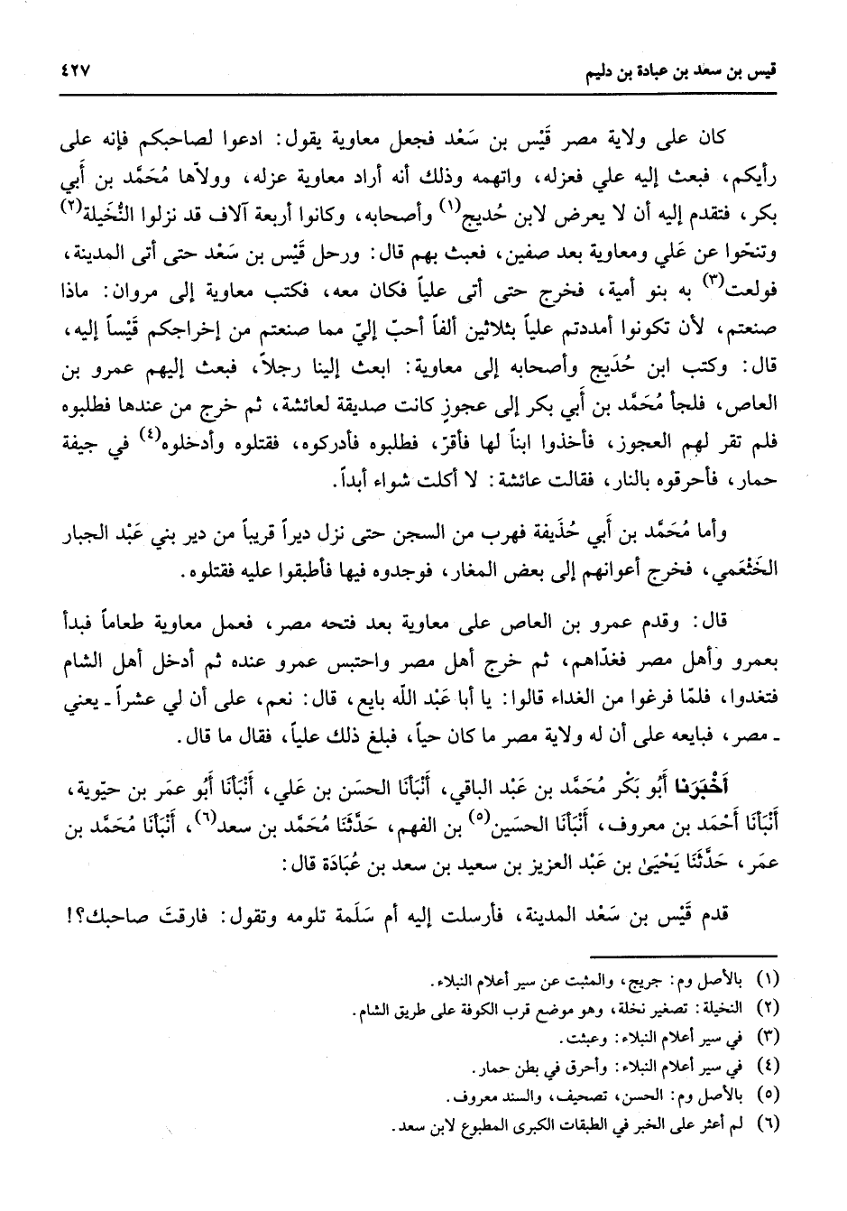 كان على ولاية مصر قيس بن سعد فجعل معاوية يقول ادعوا لصاحبكم فإنه على رأيكم فبعث إليه علي فعزله واتهمه وذلك أنه أراد معاوية عزله وولاها محمد بن أبي بكر فتقدم إليه أن لا يعرض لابن حديج (1) وأصحابه وكانوا أربعة آلاف قد نزلوا النخيلة (2) وتنحوا عن علي ومعاوية بعد صفين فعبث بهم قال ورحل قيس بن سعد حتى أتى المدينة فولعت (3) به بنو أمية فخرج حتى أتى عليا فكان معه فكتب معاوية إلى مروان ماذا صنعتم لأن تكونوا أمددتم عليا بثلاثين ألفا أحب إلي مما صنعتم من إخراجكم قيسا إليه قال وكتب ابن حديج وأصحابه إلى معاوية ابعث إلينا رجلا فبعث إليهم عمرو بن العاص فلجأ محمد بن أبي بكر إلى عجوز كانت صديقة لعائشة ثم خرج من عندها فطلبوه فلم تقر لهم العجوز فأخذوا ابنا لها فأقر فطلبوه فأدركوه فقتلوه وأدخلوه (4) في جيفة حمار فأحرقوه بالنار فقالت عائشة لا أكلت شواء أبدا وأما محمد بن أبي حذيفة فهرب من السجن حتى نزل ديرا قريبا من دير بني عبد الجبار الخثعمي فخرج أعوانهم إلى بعض المغار فوجدوه فيها فأطبقوا عليه فقتلوه قال وقدم عمرو بن العاص على معاوية بعد فتحه مصر فعمل معاوية طعاما فبدأ بعمرو وأهل مصر فغداهم ثم خرج أهل مصر واحتبس عمرو عنده ثم أدخل أهل الشام فتغدوا فلما فرغوا من الغداء قالوا يا أبا عبد الله بايع قال نعم على أن لي عشرا يعني مصر فبايعه على أن له ولاية مصر ما كان حيا فبلغ ذلك عليا فقال ما قال أخبرنا أبو بكر محمد بن عبد الباقي أنبأنا الحسن بن علي أنبأنا أبو عمر بن حيوية أنبأنا أحمد بن معروف أنبأنا الحسين (5) بن الفهم حدثنا محمد بن سعد (6) أنبأنا محمد بن عمر حدثنا يحيى بن عبد العزيز بن سعيد بن سعد بن عبادة قال قدم قيس بن سعد المدينة فأرسلت إليه أم سلمة تلومه وتقول فارقت صاحبك