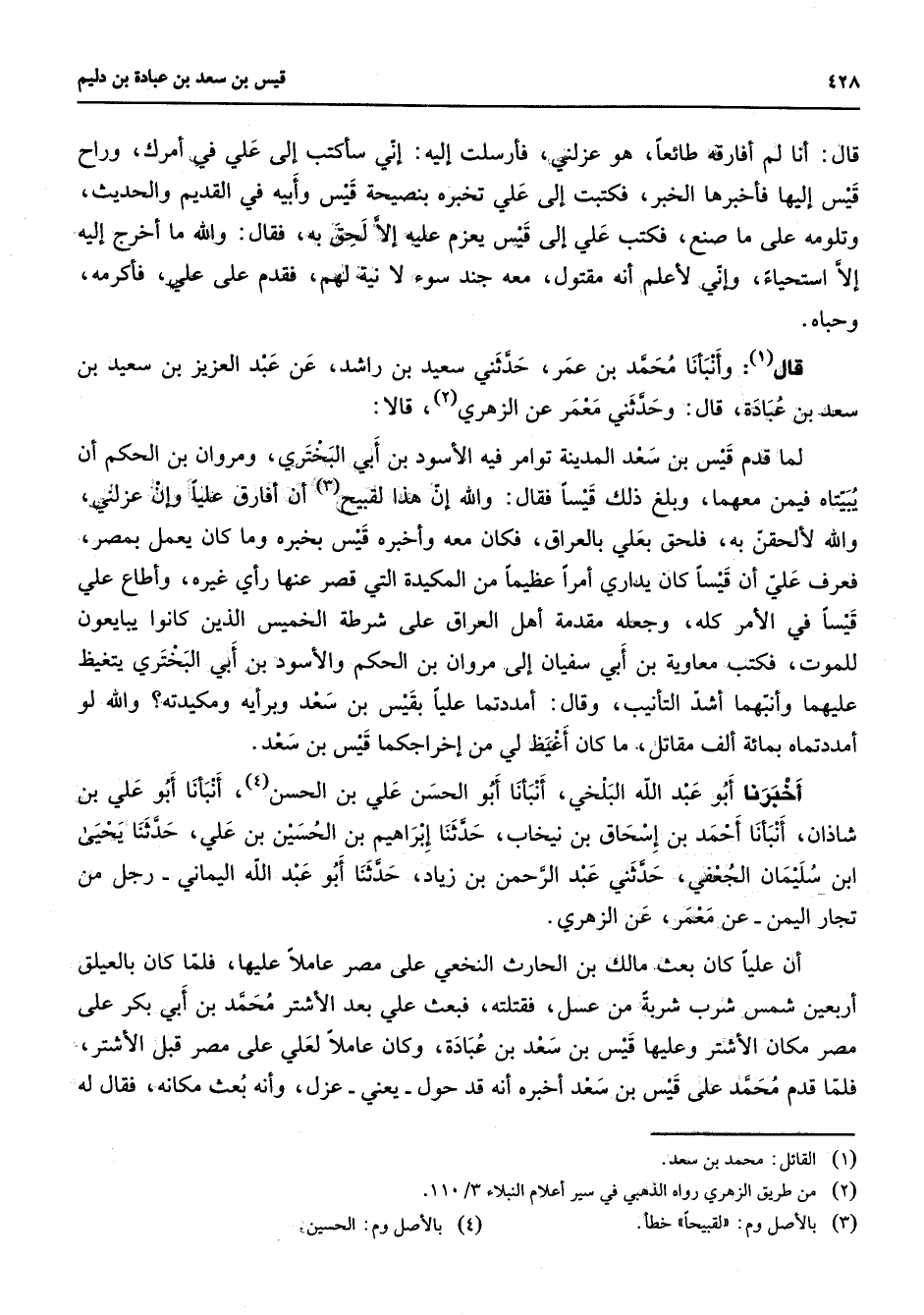 قال أنا لم أفارقه طائعا هو عزلني فأرسلت إليه إني سأكتب إلى علي في أمرك وراح قيس إليها فأخبرها الخبر فكتبت إلى علي تخبره بنصيحة قيس وأبيه في القديم والحديث وتلومه على ما صنع فكتب علي إلى قيس يعزم عليه إلا لحق به فقال والله ما أخرج إليه إلا استحياء وإني لأعلم أنه مقتول معه جند سوء لا نية لهم فقدم على علي فأكرمه وحباه قال (1) وأنبأنا محمد بن عمر حدثني سعيد بن راشد عن عبد العزيز بن سعيد بن سعد بن عبادة قال وحدثني معمر عن الزهري (2) قالا لما قدم قيس بن سعد المدينة توامر فيه الأسود بن أبي البختري ومروان بن الحكم أن يبيتاه فيمن معهما وبلغ ذلك قيسا فقال والله إن هذا لقبيح (3) أن أفارق عليا وإن عزلني والله لألحقن به فلحق بعلي بالعراق فكان معه وأخبره قيس بخبره وما كان يعمل بمصر فعرف علي أن قيسا كان يداري أمرا عظيما من المكيدة التي قصر عنها رأي غيره وأطاع علي قيسا في الأمر كله وجعله مقدمة أهل العراق على شرطة الخميس الذين كانوا يبايعون للموت فكتب معاوية بن أبي سفيان إلى مروان بن الحكم والأسود بن أبي البختري يتغيظ عليهما وأنبهما أشد التأنيب وقال أمددتما عليا بقيس بن سعد وبرأيه ومكيدته والله لو أمددتماه بمائة ألف مقاتل ما كان أغيظ لي من إخراجكما قيس بن سعد أخبرنا أبو عبد الله البلخي أنبأنا أبو الحسن علي بن الحسن (4) أنبأنا أبو علي بن شاذان أنبأنا أحمد بن إسحاق بن نيخاب حدثنا إبراهيم بن الحسين بن علي حدثنا يحيى ابن سليمان الجعفي حدثني عبد الرحمن بن زياد حدثنا أبو عبد الله اليماني رجل من تجار اليمن عن معمر عن الزهري أن عليا كان بعث مالك بن الحارث النخعي على مصر عاملا عليها فلما كان بالعيلق أربعين شمس شرب شربة من عسل فقتلته فبعث علي بعد الأشتر محمد بن أبي بكر على مصر مكان الأشتر وعليها قيس بن سعد بن عبادة وكان عاملا لعلي على مصر قبل الأشتر فلما قدم محمد على قيس بن سعد أخبره أنه قد حول يعني عزل وأنه بعث مكانه فقال له