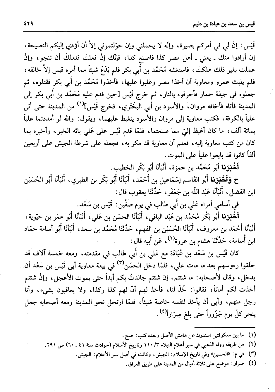 قيس إن لي في أمركم بصيرة وإنه لا يحملني وإن حولتموني إلا أن أؤدي إليكم النصيحة إن أرادوا منك يعني أهل مصر كذا فاصنع كذا فإنك إن فعلت فلعلك أن تنجو وإن عملت بغير ذلك هلكت فاستغشه محمد بن أبي بكر فلم يدع شيئا مما أمره قيس إلا خالفه فلم يلبث عمرو ومعاوية أن أخذا مصر وغلبوا عليها فأخذوا محمد بن أبي بكر فقتلوه ثم جعلوه في جيفة حمار فأحرقوه بالنار ثم خرج قيس حين قدم عليه محمد بن أبي بكر إلى المدينة فأتاه فأخافه مروان والأسود بن أبي البختري فخرج قيس (1) من المدينة حتى أتى عليا بالكوفة فكتب معاوية إلى مروان والأسود يتغيط عليهما ويقول والله لو أمددتما عليا بمائة ألف ما كان أغيظ إلي مما صنعتما فلما قدما قيس على علي باثه الخبر وأخبره بما كان من كتب معاوية إليه فعلم أن معاوية قد مكر به فجعله على شرطة الجيش على أربعين ألفا كانوا قد بايعوا عليا على الموت أخبرنا أبو محمد بن حمزة أنبأنا أبو بكر الخطيب وأخبرنا أبو القاسم إسماعيل بن أحمد أنبأنا أبو بكر بن الطبري أنبأنا أبو الحسين ابن الفضل أنبأنا عبد الله بن جعفر حدثنا يعقوب قال في أسامي أمراء علي بن أبي طالب في يوم صفين قيس بن سعد أخبرنا أبو بكر محمد بن عبد الباقي أنبأنا الحسن بن علي أنبأنا أبو عمر بن حيوية أنبأنا أحمد بن معروف أنبأنا الحسين بن الفهم حدثنا محمد بن سعد أنبأنا أبو أسامة حماد ابن أسامة حدثنا هشام بن عروة (2) عن أبيه قال كان قيس بن سعد بن عبادة مع علي بن أبي طالب في مقدمته ومعه خمسة آلاف قد حلقوا رؤوسهم بعد ما مات علي فلما دخل الحسن (3) في بيعة معاوية أبى قيس بن سعد أن يدخل وقال لأصحابه ما شئتم إن شئتم جالدت بكم أبدا حتى يموت الأعجل وإن شئتم أخذت لكم أمانا فقالوا خذ لنا فأخذ لهم أن لهم كذا وكذا ولا يعاقبون بشئ وأنا رجل منهم وأبى أن يأخذ لنفسه خاصة شيئا فلما ارتحل نحو المدينة ومعه أصحابه جعل ينحر كل يوم جزورا حتى بلغ صرارا (4)