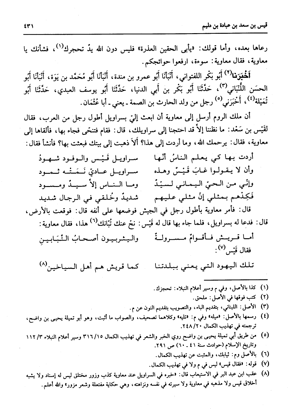(8) عقب ابن عبد البر في الاستيعاب قال: " خبره في السراويل عند معاوية كذب وزور مختلق لس له إسناد ولا يشبه أخلاق قيس ولا مذهبه في معاوية ولا سيرته في نفسه ونزاهته وهي حكاية مفتعلة وشعر مزور " والله أعلم