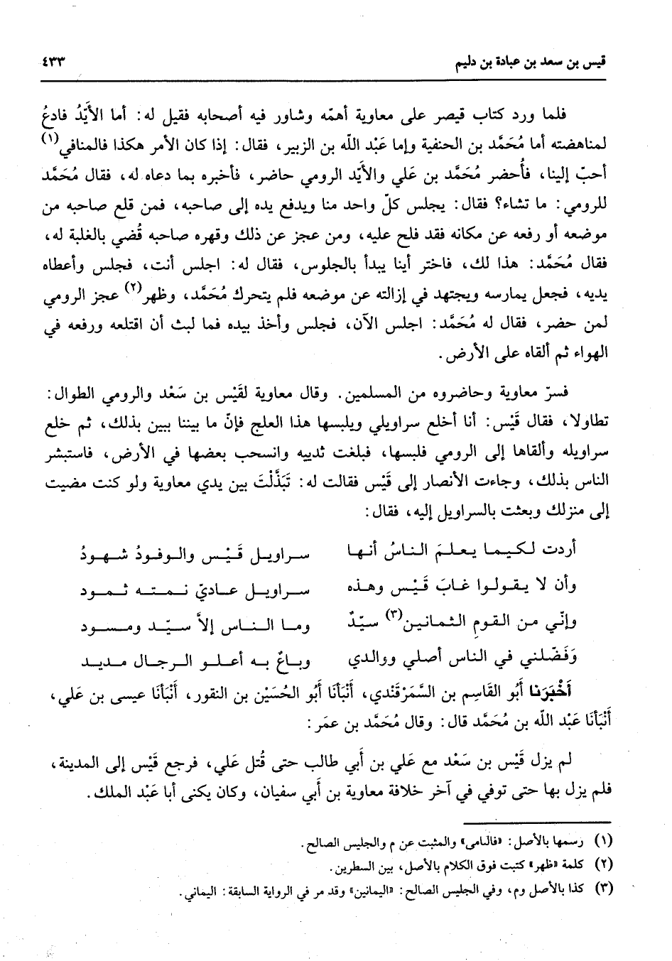 فلما ورد كتاب قيصر على معاوية أهمه وشاور فيه أصحابه فقيل له أما الأيد فادع لمناهضته أما محمد بن الحنفية وأما عبد الله بن الزبير فقال إذا كان الأمر هكذا فالمنافي (1) أحب إلينا فأحضر محمد بن علي والأيد الرومي حاضر فأخبره بما دعاه له فقال محمد للرومي ما تشاء فقال يجلس كل واحد منا ويدفع يده إلى صاحبه فمن قلع صاحبه من موضعه أو رفعه عن مكانه فقد فلح عليه ومن عجز عن ذلك وقهره صاحبه قضي بالغلبة له فقال محمد هذا لك فاختر أينا يبدأ بالجلوس فقال له اجلس أنت فجلس وأعطاه يديه فجعل يمارسه ويجتهد في إزالته عن موضعه فلم يتحرك محمد وظهر (2) عجز الرومي لمن حضر فقال له محمد اجلس الآن فجلس وأخذ بيده فما لبث أن اقتلعه ورفعه في الهواء ثم ألقاه على الأرض فسر معاوية وحاضروه من المسلمين وقال معاوية لقيس بن سعد والرومي الطوال تطاولا فقال قيس أنا أخلع سراويلي ويلبسها هذا العلج فإن ما بيننا ببين بذلك ثم خلع سراويله وألقاها إلى الرومي فلبسها فبلغت ثدييه وانسحب بعضها في الأرض فاستبشر الناس بذلك وجاءت الأنصار إلى قيس فقالت له تبذلت بين يدي معاوية ولو كنت مضيت إلى منزلك وبعثت بالسراويل إليه فقال * أردت لكيما يعلم الناس أنها * سراويل قيس والوفود شهود وأن لا يقولوا غاب قيس وهذه * سراويل عادي نمته ثمود * * وإني من القوم الثمانين (3) سيد * وما الناس إلا سيد ومسود وفضلني في الناس أصلي ووالدي * وباع به أعلو الرجال مديد * أخبرنا أبو القاسم بن السمرقندي أنبأنا أبو الحسين بن النقور أنبأنا عيسى بن علي أنبأنا عبد الله بن محمد قال وقال محمد بن عمر لم يزل قيس بن سعد مع علي بن أبي طالب حتى قتل علي فرجع قيس إلى المدينة فلم يزل بها حتى توفي في آخر خلافة معاوية بن أبي سفيان وكان يكنى أبا عبد الملك