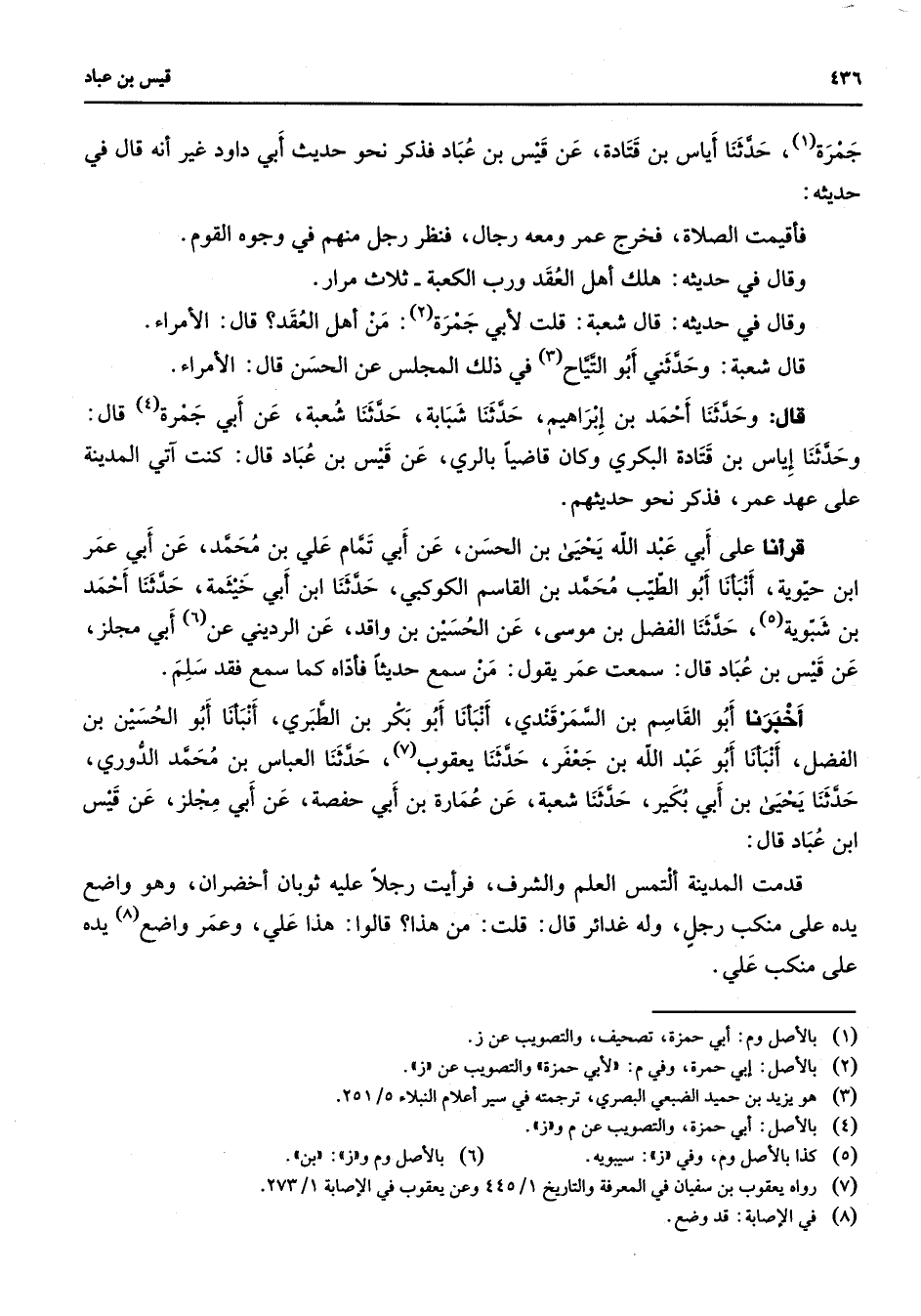 جمرة (1) حدثنا أياس بن قتادة عن قيس بن عباد فذكر نحو حديث أبي داود غير أنه قال في حديثه فأقيمت الصلاة فخرج عمر ومعه رجال فنظر رجل منهم في وجوه القوم وقال في حديثه هلك أهل العقد ورب الكعبة ثلاث مرار وقال في حديثه قال شعبة قلت لأبي جمرة (2) من أهل العقد قال الأمراء قال شعبة وحدثني أبو التياح (3) في ذلك المجلس عن الحسن قال الأمراء قال وحدثنا أحمد بن إبراهيم حدثنا شبابة حدثنا شعبة عن أبي جمرة قال وحدثنا إياس بن قتادة البكري وكان قاضيا بالري عن قيس بن عباد قال كنت آتي المدينة على عهد عمر فذكر نحو حديثهم قرأنا على أبي عبد الله يحيى بن الحسن عن أبي تمام علي بن محمد عن أبي عمر ابن حيوية أنبأنا أبو الطيب محمد بن القاسم الكوكبي حدثنا ابن أبي خيثمة حدثنا أحمد بن شبوية (5) حدثنا الفضل بن موسى عن الحسين بن واقد عن الرديني عن أبي مجلز عن قيس بن عباد قال سمعت عمر يقول من سمع حديثا فأداه كما سمع فقد سلم أخبرنا أبو القاسم بن السمرقندي أنبأنا أبو بكر بن الطبري أنبأنا أبو الحسين بن الفضل أنبأنا أبو عبد الله بن جعفر حدثنا يعقوب حدثنا العباس بن محمد الدوري حدثنا يحيى بن أبي بكير حدثنا شعبة عن عمارة بن أبي حفصة عن أبي مجلز عن قيس ابن عباد قال قدمت المدينة ألتمس العلم والشرف فرأيت رجلا عليه ثوبان أخضران وهو واضع يده على منكب رجل وله غدائر قال قلت من هذا قالوا هذا علي وعمر واضع يده على منكب علي
