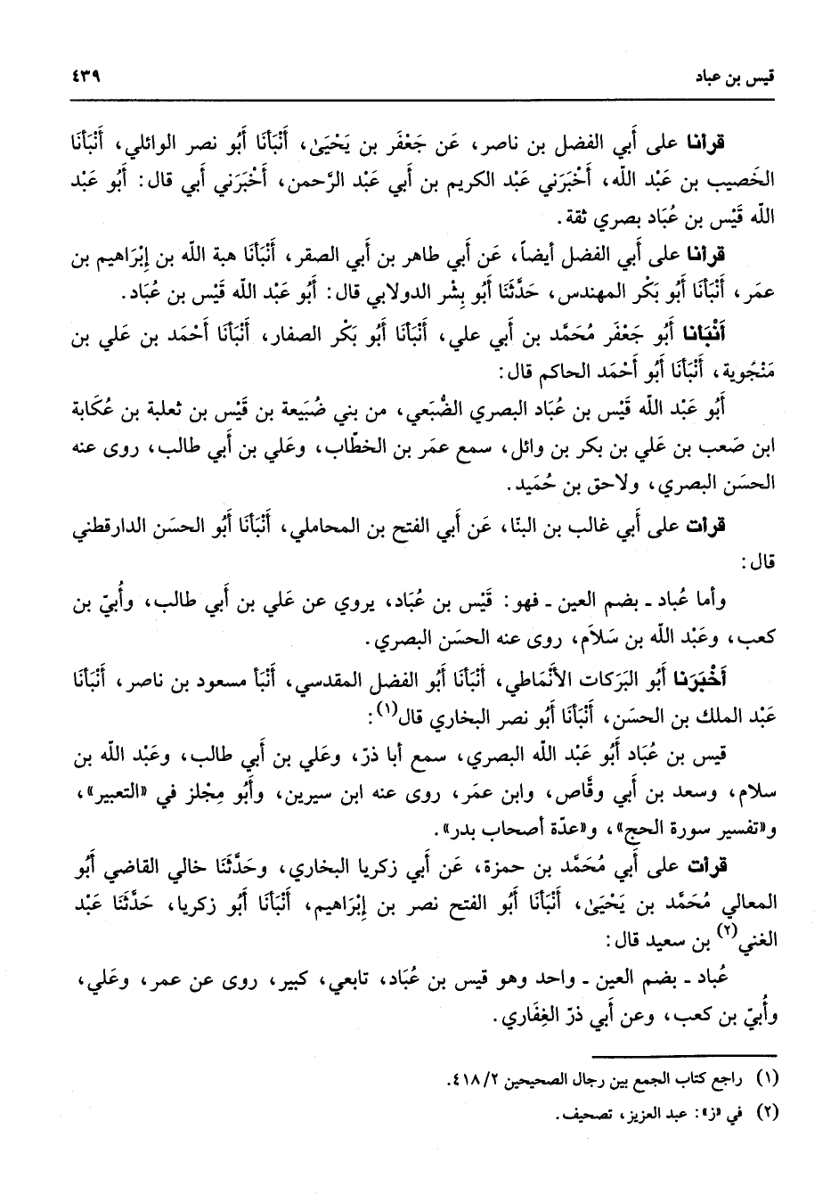 قرأنا على أبي الفضل بن ناصر عن جعفر بن يحيى أنبأنا أبو نصر الوائلي أنبأنا الخصيب بن عبد الله أخبرني عبد الكريم بن أبي عبد الرحمن أخبرني أبي قال أبو عبد الله قيس بن عباد بصري ثقة قرأنا على أبي الفضل أيضا عن أبي طاهر بن أبي الصقر أنبأنا هبة الله بن إبراهيم بن عمر أنبأنا أبو بكر المهندس حدثنا أبو بشر الدولابي قال أبو عبد الله قيس بن عباد أنبأنا أبو جعفر محمد بن أبي علي أنبأنا أبو بكر الصفار أنبأنا أحمد بن علي بن منجوية أنبأنا أبو أحمد الحاكم قال أبو عبد الله قيس بن عباد البصري الضبعي من بني ضبيعة بن قيس بن ثعلبة بن عكابة ابن صعب بن علي بن بكر بن وائل سمع عمر بن الخطاب وعلي بن أبي طالب روى عنه الحسن البصري ولاحق بن حميد قرأت على أبي غالب بن البنا عن أبي الفتح بن المحاملي أنبانا أبو الحسن الدارقطني قال وأما عباد بضم العين فهو قيس بن عباد يروي عن علي بن أبي طالب وأبي بن كعب وعبد الله بن سلام روى عنه الحسن البصري أخبرنا أبو البركات الأنماطي أنبأنا أبو الفضل المقدسي أنبأ مسعود بن ناصر أنبأنا عبد الملك بن الحسن أنبأنا أبو نصر البخاري قال (1) قيس بن عباد أبو عبد الله البصري سمع أبا ذر وعلي بن أبي طالب وعبد الله بن سلام وسعد بن أبي وقاص وابن عمر روى عنه ابن سيرين وأبو مجلز في التعبير وتفسير سورة الحج وعدة أصحاب بدر قرأت على أبي محمد بن حمزة عن أبي زكريا البخاري وحدثنا خالي القاضي أبو المعالي محمد بن يحيى أنبأنا أبو الفتح نصر بن إبراهيم أنبأنا أبو زكريا حدثنا عبد الغني (2) بن سعيد قال عباد بضم العين واحد وهو قيس بن عباد تابعي كبير روى عن عمر وعلي وأبي بن كعب وعن أبي ذر الغفاري