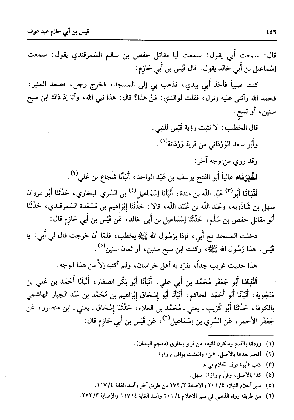 قال سمعت أبي يقول سمعت أبا مقاتل حفص بن سالم السمرقندي يقول سمعت إسماعيل بن أبي خالد يقول قال قيس بن أبي حازم كنت صبيا فأخذ أبي بيدي فذهب بي إلى المسجد فخرج رجل فصعد المنبر فحمد الله وأثنى عليه ونزل فقلت لوالدي من هذا قال هذا نبي الله وأنا إذ ذاك ابن سبع سنين أو تسع قال الخطيب لا تثبت رؤية قيس للنبي وأبو سعد الورداني من قرية وردانة (1) وقد روي من وجه آخر أخبرناه عاليا أبو الفتح يوسف بن عبد الواحد أنبأنا شجاع بن علي (2) أنبأنا أبو (3) عبد الله بن مندة أنبأنا إسماعيل (4) بن السري البخاري حدثنا أبو مروان سهل بن شاذويه وعبد الله بن عبيد الله قالا حدثنا إبراهيم بن مسعدة السمرقندي حدثنا أبو مقاتل حفص بن سلم حدثنا إسماعيل بن أبي خالد عن قيس بن أبي حازم قال دخلت المسجد مع أبي فإذا برسول الله (صلى الله عليه وسلم) يخطب فلما أن خرجت قال لي أبي يا قيس هذا رسول الله (صلى الله عليه وسلم) وكنت ابن سبع سنين أو ثمان سنين (5) هذا حديث غريب جدا تفرد به أهل خراسان ولم أكتبه إلا من هذا الوجه أنبأنا أبو جعفر محمد بن أبي علي أنبأنا أبو بكر الصفار أنبأنا أحمد بن علي بن منجوية أنبأنا أبو أحمد الحاكم أنبأنا أبو إسحاق إبراهيم بن محمد بن عبد الجبار الهاشمي بالكوفة حدثنا أبو كريب يعني محمد بن العلاء حدثنا إسحاق يعني ابن منصور عن جعفر الأحمر عن السري بن إسماعيل (6) عن قيس بن أبي حازم قال