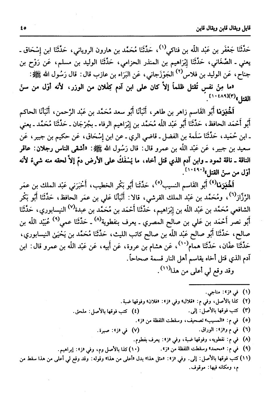 [10490] أخبرنا أبو القاسم النسيب (5) حدثنا أبو بكر الخطيب أخبرني عبد الملك بن عمر الرزاز (6) ومحمد بن عبد الملك القرشي قالا أنبأنا علي بن عمر الحافظ حدثنا أبو بكر الشافعي محمد بن عبد الله بن إبراهيم حدثنا أحمد بن محمد بن عبدة (7) النيسابوري حدثنا أبو نصر أحمد بن علي بن صالح المصري يعرف بنفطوية (8) حدثنا عمي (9) عبيد الله بن صالح حدثنا أبو صالح عبد الله بن صالح كاتب الليث حدثنا محمد بن يحيى النيسابوري حدثنا عفان حدثنا همام (10) عن هشام بن عروة عن أبيه عن عبد الله بن عمرو قال ابن آدم الذي قتل أخاه يقاسم أهل الناس قسمة صحاحا وقد وقع لي أعلى من هذا (11)