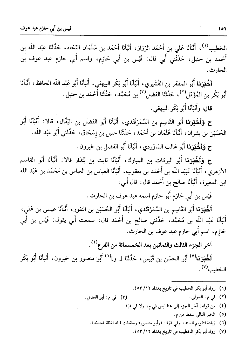الخطيب (1) أنبأنا علي بن أحمد الرزار أنبأنا أحمد بن سلمان النجاد حدثنا عبد الله بن أحمد بن حنبل حدثني أبي قال قيس بن أبي حازم واسم أبي حازم عبد عوف بن الحارث أخبرنا أبو المظفر بن القشيري أنبأنا أبو بكر البيهقي أنبأنا أبو عبد الله الحافظ أنبأنا أبو بكر بن المؤمل (2) حدثنا الفضل (3) بن محمد حدثنا أحمد بن حنبل قال وأنبأنا أبو بكر البيهقي وأخبرنا أبو القاسم بن السمرقندي أنبأنا أبو الفضل بن البقال قالا أنبأنا أبو الحسين بن بشران أنبأنا عثمان بن أحمد حدثنا حنبل بن إسحاق حدثني أبو عبد الله وأخبرنا أبو غالب الماوردي أنبأنا أبو الفضل بن خيرون وأخبرنا أبو البركات بن المبارك أنبأنا ثابت بن بندار قالا أنبأنا أبو القاسم الأزهري أنبأنا عبيد الله بن أحمد بن يعقوب أنبأنا العباس بن العباس بن محمد بن عبد الله ابن المغيرة أنبأنا صالح بن أحمد قال قال أبي قيس بن أبي حازم أبو حازم اسمه عبد عوف بن الحارث أخبرنا أبو القاسم بن السمرقندي أنبأنا أبو الحسين بن النقور أنبأنا عيسى بن علي أنبأنا عبد الله بن محمد حدثني صالح بن أحمد قال سمعت أبي يقول قيس بن أبي حازم اسم أبي حازم عبد عوف بن الحارث آخر الجزء الثالث والثمانين بعد الخمسمائة من الفرع (4) أخبرنا (5) أبو الحسن بن قبيس حدثنا و (6) أبو منصور بن خيرون أنبأنا أبو بكر الخطيب (7)