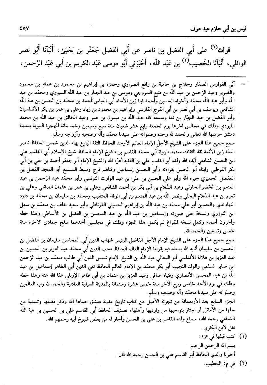 سمع جميع هذا الجزء على الشيخ الامام الاجل الفاضل الرئيس شهاب الدين أبي المحاسن سليمان بن الفضل بن الحسين بن سليمان أثابه الله بسنده فيه بقراءة الامام العالم الحافظ محب الدين أبي محمد عبد العزيز بن الحسين بن عبد العزيز بن هلالة الاندلسي أبو المعالي عبد الله بن الشيخ الامام شمس الدين أبي طالب محمد بن عبد الرحمن ابن صار السلمي والولد النجيب أبو بكر محمد بن الامام العالم الحافظ تقي الدين أبي الطاهر إسماعيل بن عبد الله بن عبد المحسن الانصاري وفتياه صافي وعبد العزيز بن عثمان بن أبي طاهر الاربلي عفا الله عنه وهذا خطه وذلك في يوم الاحد خامس ربيع الاخر سنة خمس عشرة وستمائة بالمدينة السيفية العادلية والحمد لله رب العالمين وصلواته على سيدنا محمد وآله وصحبه وسلم