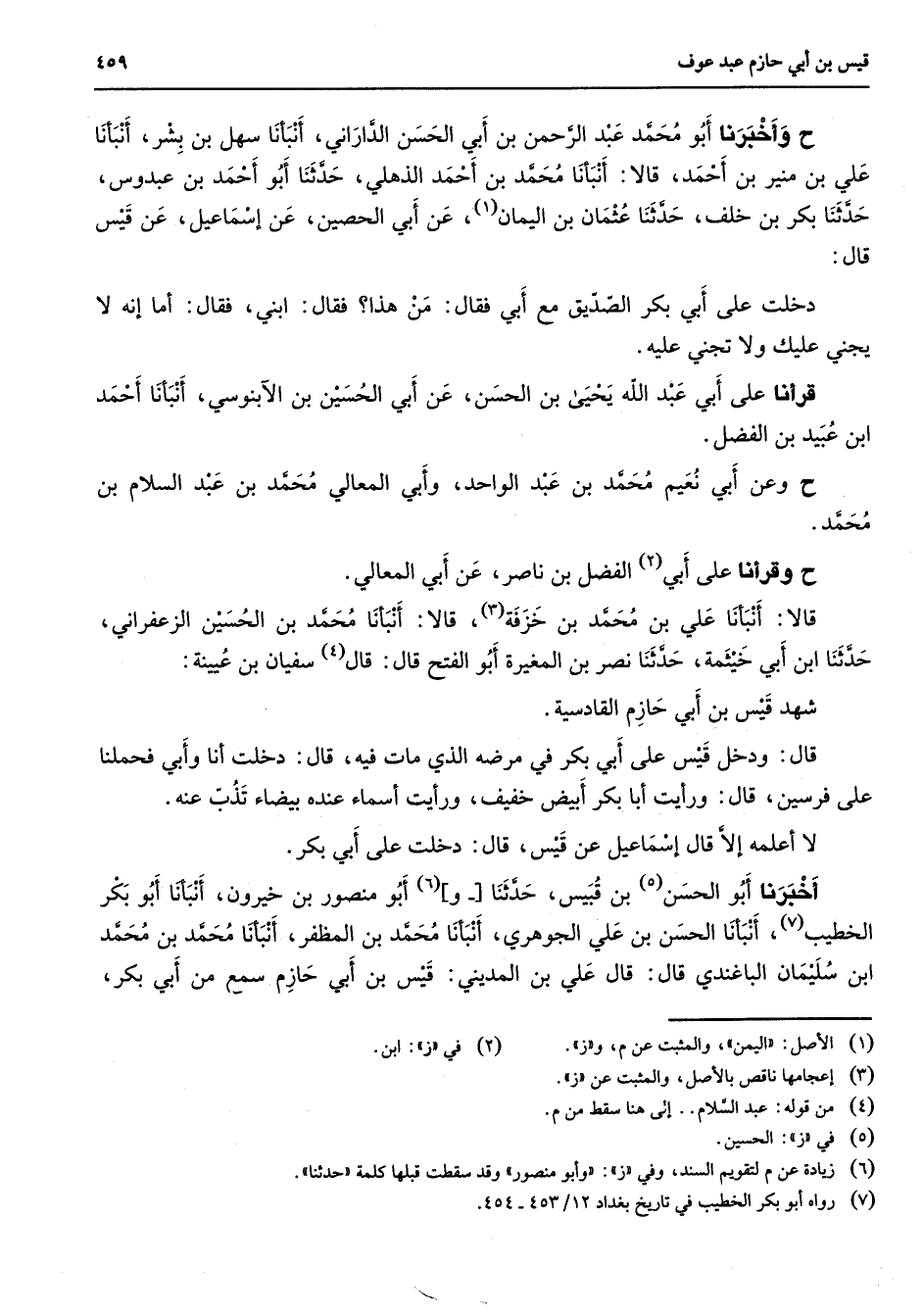 وأخبرنا أبو محمد عبد الرحمن بن أبي الحسن الداراني أنبأنا سهل بن بشر أنبأنا علي بن منير بن أحمد قالا أنبأنا محمد بن أحمد الذهلي حدثنا أبو أحمد بن عبدوس حدثنا بكر بن خلف حدثنا عثمان بن اليمان (1) عن أبي الحصين عن إسماعيل عن قيس قال دخلت على أبي بكر الصديق مع أبي فقال من هذا فقال ابني فقال أما إنه لا يجني عليك ولا تجني عليه قرأنا على أبي عبد الله يحيى بن الحسن عن أبي الحسين بن الآبنوسي أنبأنا أحمد ابن عبيد بن الفضل وعن أبي نعيم محمد بن عبد الواحد وأبي المعالي محمد بن عبد السلام بن محمد وقرأنا على أبي (2) الفضل بن ناصر عن أبي المعالي قالا أنبأنا علي بن محمد بن خزفة (3) قالا أنبأنا محمد بن الحسين الزعفراني حدثنا ابن أبي خيثمة حدثنا نصر بن المغيرة أبو الفتح قال قال (4) سفيان بن عيينة شهد قيس بن أبي حازم القادسية قال ودخل قيس على أبي بكر في مرضه الذي مات فيه قال دخلت أنا وأبي فحملنا على فرسين قال ورأيت أبا بكر أبيض خفيف ورأيت أسماء عنده بيضاء تذب عنه لا أعلمه إلا قال إسماعيل عن قيس قال دخلت على أبي بكر أخبرنا أبو الحسن (5) بن قبيس حدثنا و (6) أبو منصور بن خيرون أنبأنا أبو بكر (7) الخطيب أنبأنا الحسن بن علي الجوهري أنبأنا محمد بن المظفر أنبأنا محمد بن محمد بن سليمان الباغندي قال قال علي بن المديني قيس بن أبي حازم سمع من أبي بكر