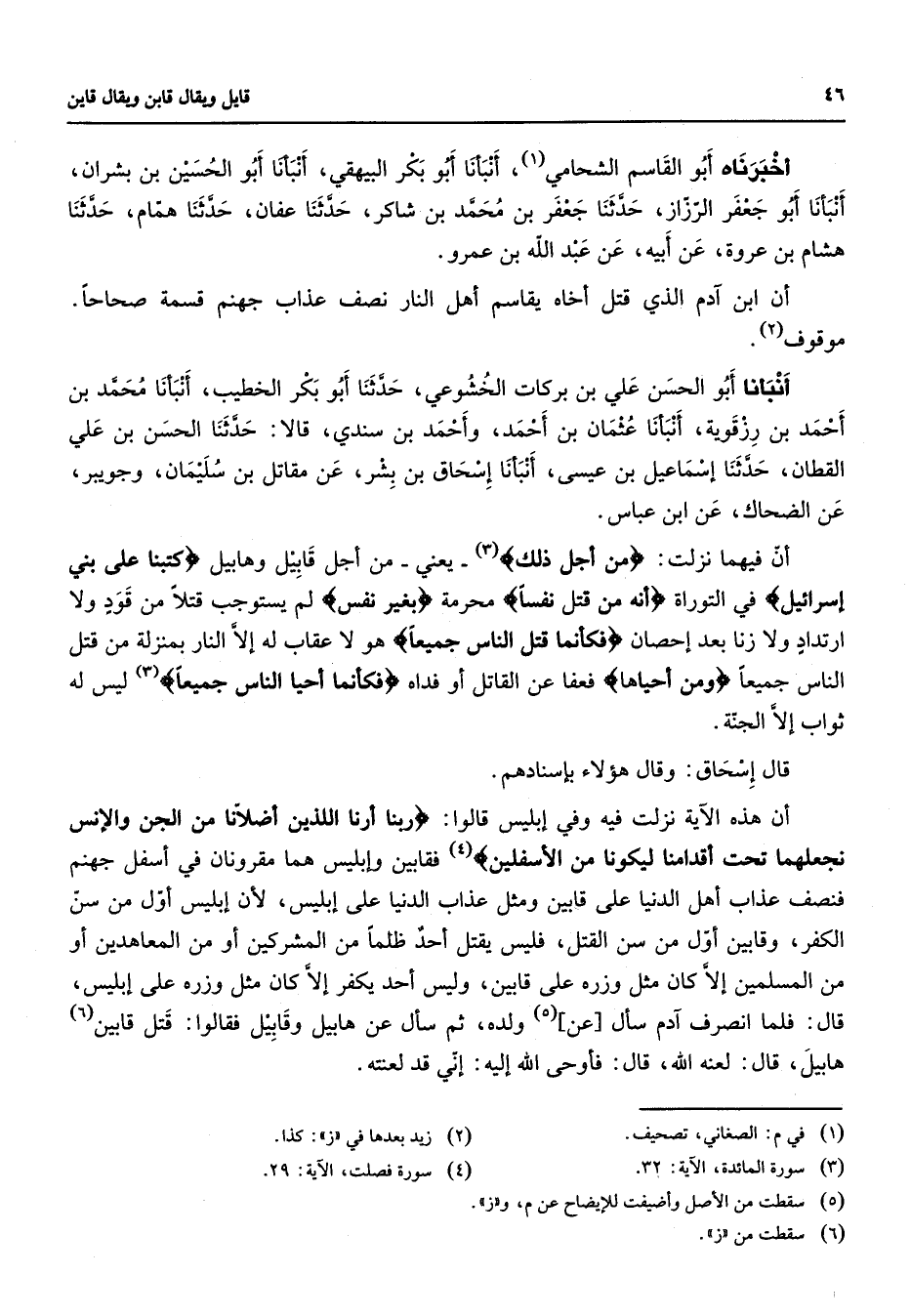 أخبرناه أبو القاسم الشحامي (1) أنبأنا أبو بكر البيهقي أنبأنا أبو الحسين بن بشران أنبأنا أبو جعفر الرزاز حدثنا جعفر بن محمد بن شاكر حدثنا عفان حدثنا همام حدثنا هشام بن عروة عن أبيه عن عبد الله بن عمرو أن ابن آدم الذي قتل أخاه يقاسم أهل النار نصف عذاب جهنم قسمة صحاحا موقوف (2) أنبأنا أبو الحسن علي بن بركات الخشوعي حدثنا أبو بكر الخطيب أنبأنا محمد بن أحمد بن رزقوية أنبأنا عثمان بن أحمد وأحمد بن سندي قالا حدثنا الحسن بن علي القطان حدثنا إسماعيل بن عيسى أنبأنا إسحاق بن بشر عن مقاتل بن سليمان وجويبر عن الضحاك عن ابن عباس أن فيهما نزلت " من أجل ذلك " (3) يعني من أجل قابيل وهابيل " كتبنا على بني إسرائيل " في التوراة " أنه من قتل نفسا " محرمة " بغير نفس " لم يستوجب قتلا من قود ولا ارتداد ولا زنا بعد إحصان " فكأنما قتل الناس جميعا " هو لا عقاب له إلا النار بمنزلة من قتل الناس جميعا " ومن أحياها " فعفا عن القاتل أو فداه " فكأنما أحيا الناس جميعا " (3) ليس له ثواب إلا الجنة قال إسحاق وقال هؤلاء بإسنادهم إن هذه الآية نزلت فيه وفي إبليس قالوا " ربنا أرنا اللذين أضلانا من الجن والإنس نجعلهما تحت أقدامنا ليكونا من الأسفلين " (4) فقابين وإبليس هما مقرونان في أسفل جهنم فنصف عذاب أهل الدنيا على قابين ومثل عذاب الدنيا على إبليس لأن إبليس أول من سن الكفر وقابين أول من سن القتل فليس يقتل أحد ظلما من المشركين أو من المعاهدين أو من المسلمين إلا كان مثل وزره على قابين وليس أحد يكفر إلا كان مثل وزره على إبليس قال فلما انصرف آدم سأل عن (5) ولده ثم سأل عن هابيل وقابيل فقالوا قتل قابين (6) هابيل قال لعنه الله قال فأوحى الله إليه إني قد لعنته