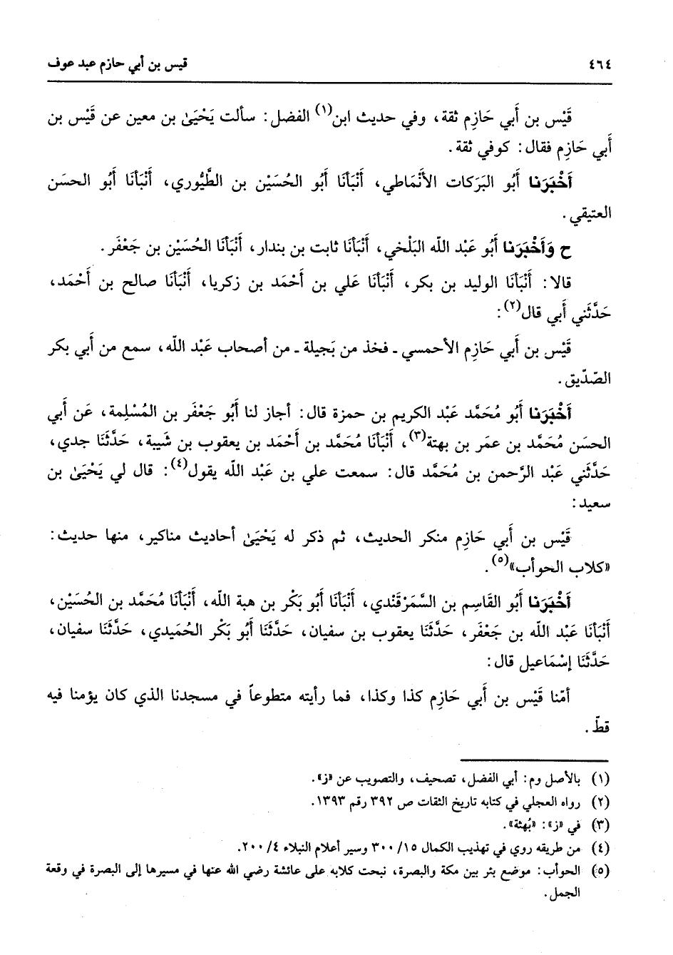قيس بن أبي حازم ثقة وفي حديث ابن (1) الفضل سألت يحيى بن معين عن قيس بن أبي حازم فقال كوفي ثقة أخبرنا أبو البركات الأنماطي أنبأنا أبو الحسين بن الطيوري أنبأنا أبو الحسن العتيقي وأخبرنا أبو عبد الله البلخي أنبأنا ثابت بن بندار أنبأنا الحسين بن جعفر قالا أنبأنا الوليد بن بكر أنبأنا علي بن أحمد بن زكريا أنبأنا صالح بن أحمد حدثني أبي قال (2) قيس بن أبي حازم الأحمسي فخذ من بجيلة من أصحاب عبد الله سمع من أبي بكر الصديق أخبرنا أبو محمد عبد الكريم بن حمزة قال أجاز لنا أبو جعفر بن المسلمة عن أبي الحسن محمد بن عمر بن بهتة (3) أنبأنا محمد بن أحمد بن يعقوب بن شيبة حدثنا جدي حدثني عبد الرحمن بن محمد قال سمعت علي بن عبد الله يقول (4) قال لي يحيى بن سعيد قيس بن أبي حازم منكر الحديث ثم ذكر له يحيى أحاديث مناكير منها حديث كلاب الحوأب (5) أخبرنا أبو القاسم بن السمرقندي أنبأنا أبو بكر بن هبة الله أنبأنا محمد بن الحسين أنبأنا عبد الله بن جعفر حدثنا يعقوب بن سفيان حدثنا أبو بكر الحميدي حدثنا سفيان حدثنا إسماعيل قال أمنا قيس بن أبي حازم كذا وكذا فما رأيته متطوعا في مسجدنا الذي كان يؤمنا فيه قط