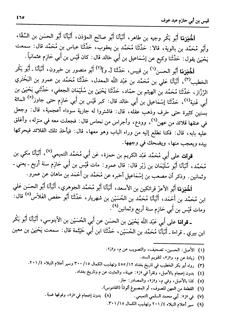 أخبرنا أبو بكر وجيه بن طاهر أنبأنا أبو صالح المؤذن أنبأنا أبو الحسن بن السقا وأبو محمد بن بالوية قالا حدثنا محمد بن يعقوب حدثنا عباس بن محمد قال سمعت يحيى يقول حدثنا وكيع عن إسماعيل بن أبي خالد قال كان قيس بن أبي حازم عثمانيا أخبرنا أبو الحسن (1) بن قبيس حدثنا و (2) أبو منصور بن خيرون أنبأنا أبو بكر الخطيب (3) أنبأنا علي بن محمد بن عبد الله المعدل حدثنا محمد بن عمرو بن البختري الرزاز حدثنا محمد بن الهيثم بن حماد حدثنا يحيى بن سليمان الجعفي حدثني يحيى بن أبي غنية (4) حدثنا إسماعيل بن أبي خالد قال كبر قيس بن أبي حازم حتى جاوز (5) المائة بسنين كثيرة حتى خرف وذهب عقله قال فاشتروا له جارية سوداء أعجمية قال وجعل في عنقها قلائد من عهن (6) وودع وأجراس من نحاس قال فجعلت معه في منزله وأغلق عليه بابه قال فكنا نطلع إليه من وراء الباب وهو معها قال فيأخذ تلك القلائد فيحركها بيده ويعجب منها ويضحك في وجهها قرأت على أبي محمد عبد الكريم بن حمزة عن أبي محمد التميمي (7) أنبأنا مكي بن محمد أنبأنا أبو سليمان بن زبر قال قال عمرو مات قيس بن أبي حازم سنة أربع يعني وثمانين وذكر أن مصعب بن إسماعيل أخبره عن محمد بن أحمد بن ماهان عن عمرو أخبرنا أبو الأعز قراتكين بن الأسعد أنبأنا أبو محمد الجوهري أنبأنا أبو الحسن علي بن محمد بن أحمد أنبأنا محمد بن الحسين بن شهريار حدثنا أبو حفص الفلاس (8) قال ومات قيس بن أبي حازم سنة أربع وثمانين (9) قرأنا على أبي عبد الله يحيى بن الحسن عن أبي الحسين بن الآبنوسي أنبأنا أبو بكر ابن بيري قراءة أنبأنا محمد بن الحسين حدثنا ابن أبي خيثمة قال سمعت يحيى بن معين