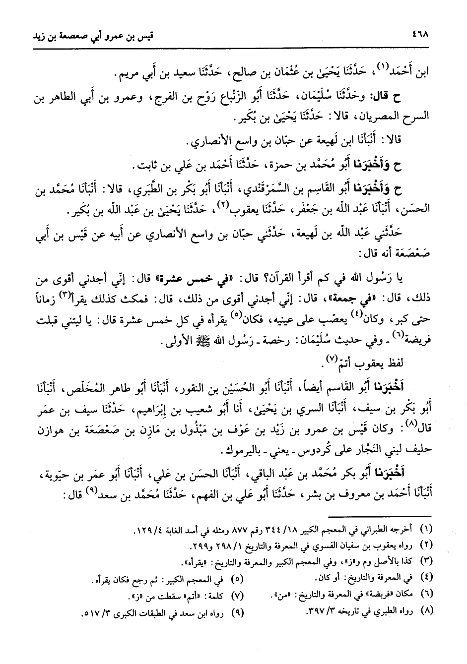 ابن أحمد (1) حدثنا يحيى بن عثمان بن صالح حدثنا سعيد بن أبي مريم قال وحدثنا سليمان حدثنا أبو الزنباع روح بن الفرج وعمرو بن أبي الطاهر بن السرح المصريان قالا حدثنا يحيى بن بكير قالا أنبأنا ابن لهيعة عن حبان بن واسع الأنصاري وأخبرنا أبو محمد بن حمزة حدثنا أحمد بن علي بن ثابت وأخبرنا أبو القاسم بن السمرقندي أنبأنا أبو بكر بن الطبري قالا أنبأنا محمد بن الحسن أنبأنا عبد الله بن جعفر حدثنا يعقوب (2) حدثنا يحيى بن عبد الله بن بكير حدثني عبد الله بن لهيعة حدثني حبان بن واسع الأنصاري عن أبيه عن قيس بن أبي صعصعة أنه قال يا رسول الله في كم أقرأ القرآن قال في خمس عشرة قال إني أجدني أقوى من ذلك قال في جمعة قال إني أجدني أقوى من ذلك قال فمكث كذلك يقرأ (3) زمانا حتى كبر وكان (4) يعصب على عينيه فكان (5) يقرأه في كل خمس عشرة قال يا ليتني قبلت فريضة (6) وفي حديث سليمان رخصة رسول الله (صلى الله عليه وسلم) الأولى لفظ يعقوب أتم (7) أخبرنا أبو القاسم أيضا أنبأنا أبو الحسين بن النقور أنبأنا أبو طاهر المخلص أنبأنا أبو بكر بن سيف أنبأنا السري بن يحيى أنا أبو شعيب بن إبراهيم حدثنا سيف بن عمر قال (8) وكان قيس بن عمرو بن زيد بن عوف بن مبذول بن مازن بن صعصعة بن هوازن حليف لبني النجار على كردوس يعني باليرموك أخبرنا أبو بكر محمد بن عبد الباقي أنبأنا الحسن بن علي أنبأنا أبو عمر بن حيوية أنبأنا أحمد بن معروف بن بشر حدثنا أبو علي بن الفهم حدثنا محمد بن سعد (9) قال