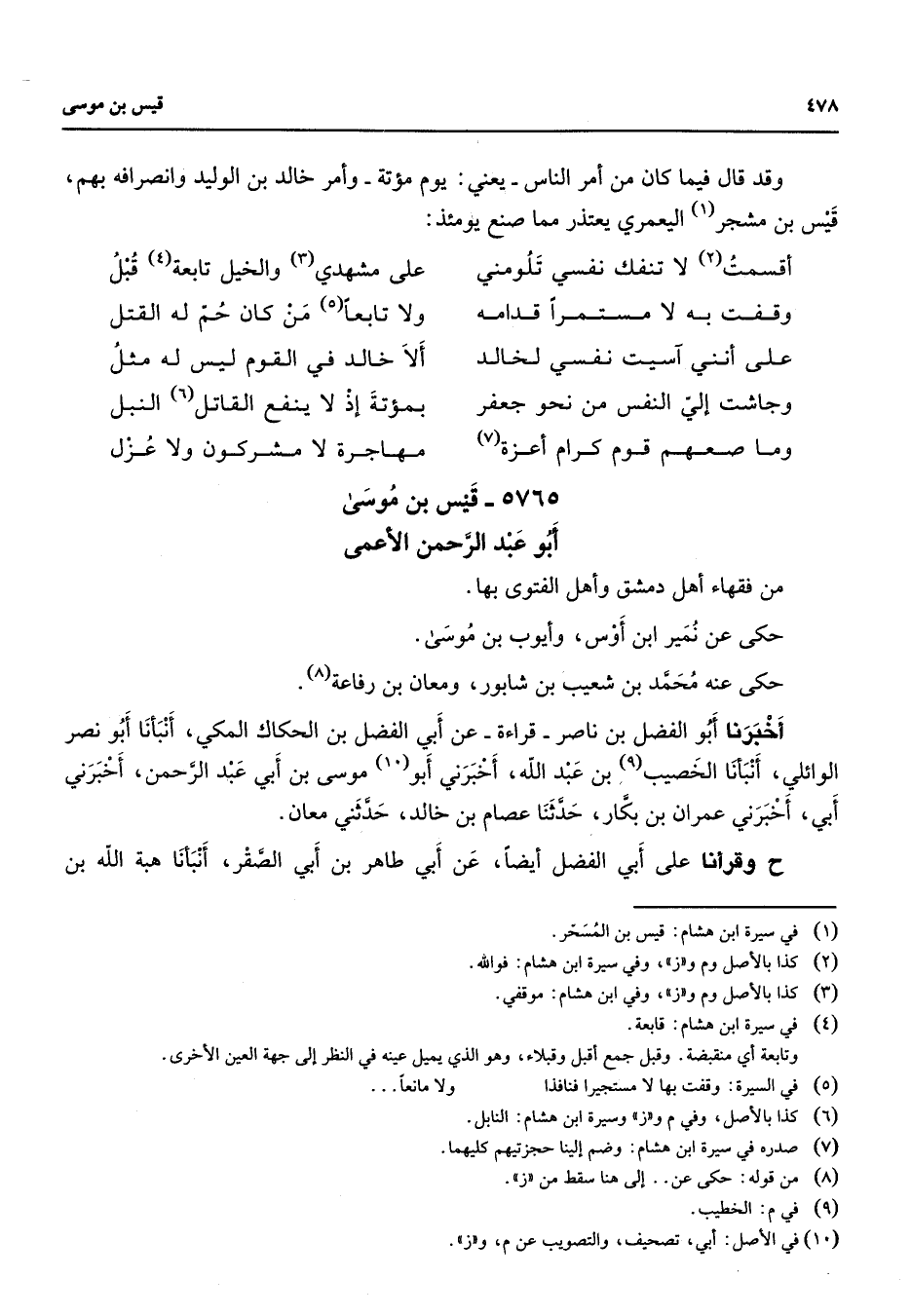 5765 - قيس بن موسى أبو عبد الرحمن الأعمى من فقهاء أهل دمشق وأهل الفتوى بها حكى عن نمير بن أوس وأيوب بن موسى حكى عنه محمد بن شعيب بن شابور ومعان بن رفاعة (8) أخبرنا أبو الفضل بن ناصر قراءة عن أبي الفضل بن الحكاك المكي أنبأنا أبو نصر الوائلي أنبأنا الخصيب (9) بن عبد الله أخبرني أبو (10) موسى بن أبي عبد الرحمن أخبرني أبي أخبرني عمران بن بكار حدثنا عصام بن خالد حدثني معان وقرأنا على أبي الفضل أيضا عن أبي طاهر بن أبي الصقر أنبأنا هبة الله بن