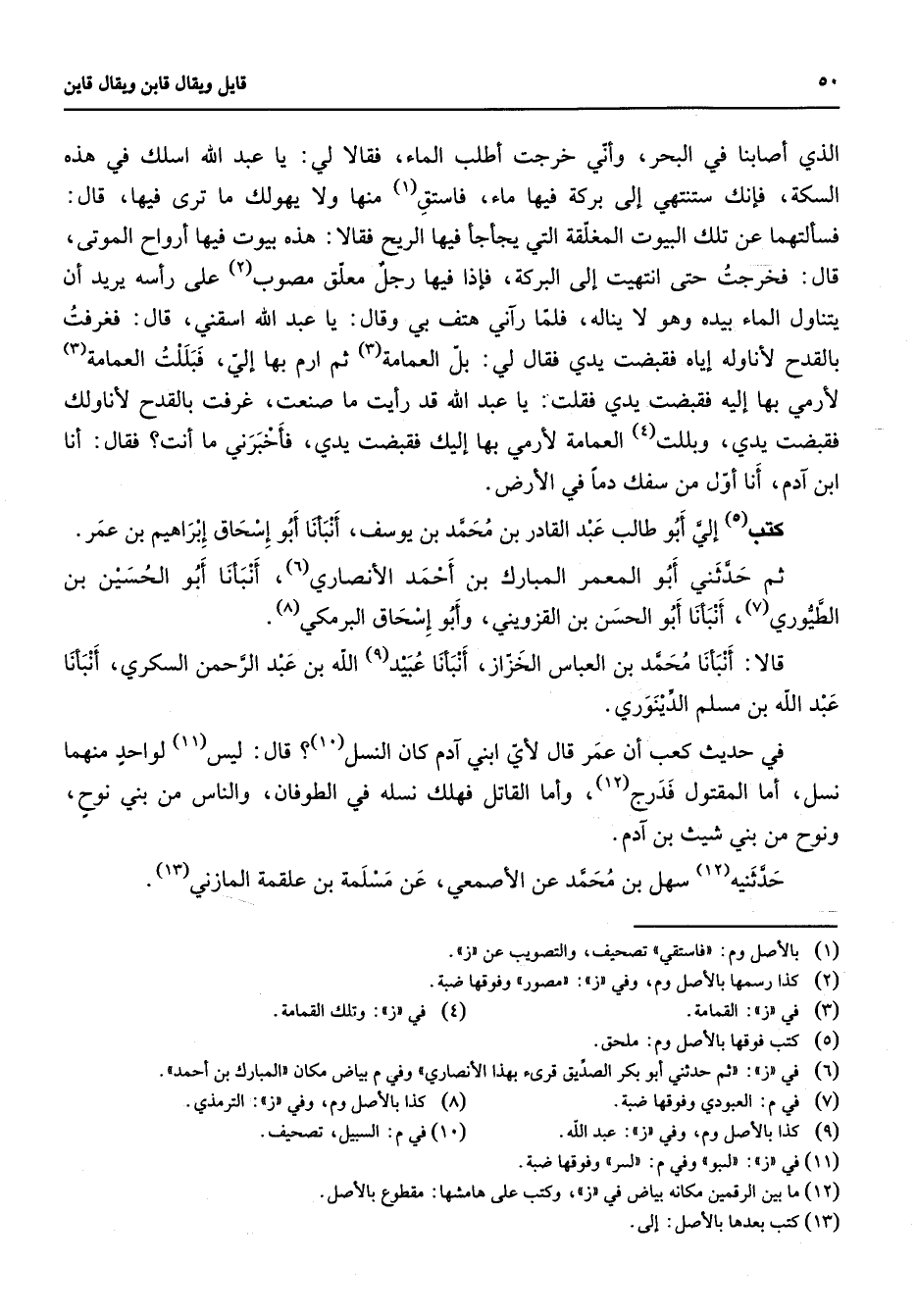 الذي أصابنا في البحر وأني خرجت أطلب الماء فقالا لي يا عبد الله اسلك في هذه السكة فإنك ستنتهي إلى بركة فيها ماء فاستق (1) منها ولا يهولك ما ترى فيها قال فسألتهما عن تلك البيوت المغلقة التي يجأجأ فيها الريح فقالا هذه بيوت فيها أرواح الموتى قال فخرجت حتى انتهيت إلى البركة فإذا فيها رجل معلق مصوب (2) على رأسه يريد أن يتناول الماء بيده وهو لا يناله فلما رآني هتف بي وقال يا عبد الله اسقني قال فغرفت بالقدح لأناوله إياه فقبضت يدي فقال لي بل العمامة (3) ثم ارم بها إلي فبللت العمامة (3) لأرمي بها إليه فقبضت يدي فقلت يا عبد الله قد رأيت ما صنعت غرفت بالقدح لأناولك فقبضت يدي وبللت (4) العمامة لأرمي بها إليك فقبضت يدي فأخبرني ما أنت فقال أنا ابن آدم أنا أول من سفك دما في الأرض كتب (5) إلي أبو طالب عبد القادر بن محمد بن يوسف أنبأنا أبو إسحاق إبراهيم بن عمر ثم حدثني أبو المعمر المبارك بن أحمد الأنصاري (6) أنبأنا أبو الحسين بن الطيوري (7) أنبأنا أبو الحسن بن القزويني وأبو إسحاق البرمكي (8) قالا أنبأنا محمد بن العباس الخزاز أنبأنا عبيد (9) الله بن عبد الرحمن السكري أنبأنا عبد الله بن مسلم الدينوري في حديث كعب أن عمر قال لأي ابني آدم كان النسل (10) قال ليس (11) لواحد منهما نسل أما المقتول فدرج (12) وأما القاتل فهلك نسله في الطوفان والناس من بني نوح ونوح من بني شيث بن آدم حدثنيه (12) سهل بن محمد عن الأصمعي عن مسلمة بن علقمة المازني " (13)