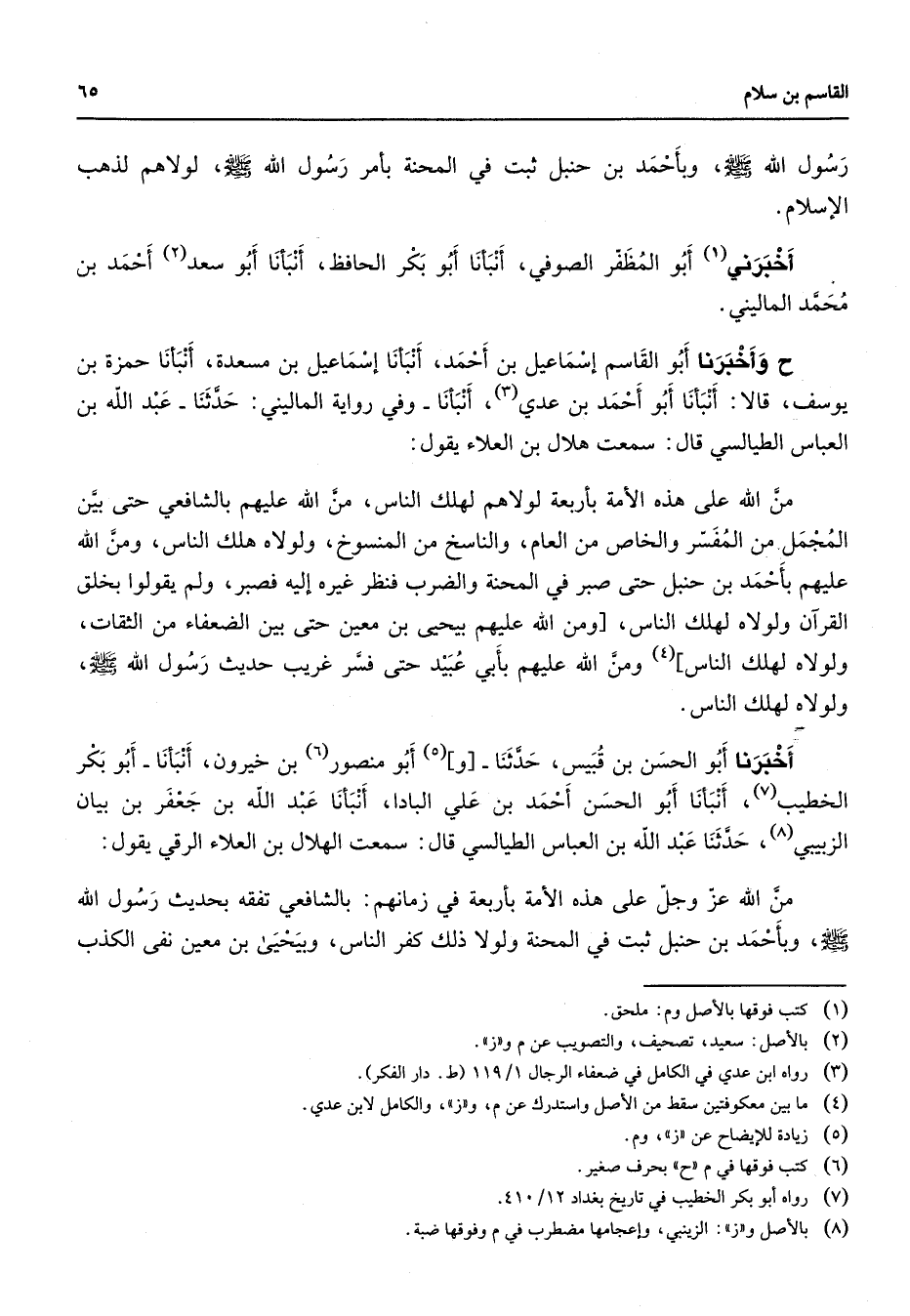 رسول الله (صلى الله عليه وسلم) وبأحمد بن حنبل ثبت في المحنة بأمر رسول الله (صلى الله عليه وسلم) لولاهم لذهب الإسلام أخبرني (1) أبو المظفر الصوفي أنبأنا أبو بكر الحافظ أنبأنا أبو سعد (2) أحمد بن محمد الماليني وأخبرنا أبو القاسم إسماعيل بن أحمد أنبأنا إسماعيل بن مسعدة أنبأنا حمزة بن يوسف قالا أنبأنا أبو أحمد بن عدي (3) أنبأنا وفي رواية الماليني حدثنا عبد الله بن العباس الطيالسي قال سمعت هلال بن العلاء يقول من الله على هذه الأمة بأربعة لولاهم لهلك الناس من الله عليهم بالشافعي حتى بين المجمل من المفسر والخاص من العام والناسخ من المنسوخ ولولاه هلك الناس ومن الله عليهم بأحمد بن حنبل حتى صبر في المحنة والضرب فنظر غيره إليه فصبر ولم يقولوا بخلق القرآن ولولاه لهلك الناس ومن الله عليهم بيحيى بن معين حتى بين الضعفاء من الثقات ولولاه لهلك الناس (4) ومن الله عليهم بأبي عبيد حتى فسر غريب حديث رسول الله (صلى الله عليه وسلم) ولولاه لهلك الناس أخبرنا أبو الحسن بن قبيس حدثنا و (5) أبو منصور (6) بن خيرون أنبأنا أبو بكر الخطيب (7) أنبأنا أبو الحسن أحمد بن علي البادا أنبأنا عبد الله بن جعفر بن بيان الزبيبي (8) حدثنا عبد الله بن العباس الطيالسي قال سمعت الهلال بن العلاء الرقي يقول من الله عز وجل على هذه الأمة بأربعة في زمانهم بالشافعي تفقه بحديث رسول الله (صلى الله عليه وسلم) وبأحمد بن حنبل ثبت في المحنة ولولا ذلك كفر الناس وبيحيى بن معين نفى الكذب