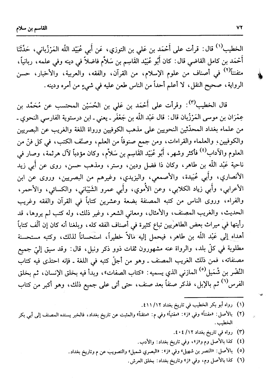 الخطيب (1) قال قرأت على أحمد بن علي بن التوزي عن أبي عبيد الله المرزباني حدثنا أحمد بن كامل القاضي قال كان أبو عبيد القاسم بن سلام فاضلا في دينه وفي علمه ربانيا متفننا (2) في أصناف من علوم الإسلام من القرآن والفقه والعربية والأخبار حسن الرواية صحيح النقل لا أعلم أحدا من الناس طعن عليه في شئ من أمره ودينه قال الخطيب (3) وقرأت على أحمد بن علي بن الحسين المحتسب عن محمد بن عمران بن موسى المرزبان قال قال عبد الله بن جعفر يعني ابن درستوية الفارسي النحوي من علماء بغداد المحدثين النحويين على مذهب الكوفيين ورواة اللغة والغريب عن البصريين والكوفيين والعلماء والقراءات ومن جمع صنوفا من العلم وصنف الكتب في كل فن من العلوم والآداب (4) فأكثر وشهر أبو عبيد القاسم بن سلام وكان مؤدبا لآل هرثمة وصار في ناحية عبد الله بن طاهر وكان ذا فضل ودين وستر ومذهب حسن روى عن أبي زيد الأنصاري وأبي عبيدة والأصمعي واليزيدي وغيرهم من البصريين وروى عن ابن الأعرابي وأبي زياد الكلابي وعن الأموي وأبي عمرو الشيباني والكسائي والأحمر والفراء وروى الناس من كتبه المصنفة بضعة وعشرين كتابا في القرآن والفقه وغريب الحديث والغريب المصنف والأمثال ومعاني الشعر وغير ذلك وله كتب لم يروها قد رأيتها في ميراث بعض الطاهريين تباع كثيرة في أصناف الفقه كله وبلغنا أنه كان إن ألف كتابا أهداه إلى عبد الله بن طاهر فيحمل إليه مالا خطيرا استحسانا لذلك وكتبه مستحسنة مطلوبة في كل بلد والرواة عنه مشهورون ثقات ذوو ذكر ونبل قال وقد سيق إلي جميع مصنفاته فمن ذلك الغريب المصنف وهو من أجل كتبه في اللغة فإنه احتذى فيه كتاب النضر بن شميل (5) المازني الذي يسميه كتاب الصفات وبدأ فيه بخلق الإنسان ثم بخلق الفرس (6) ثم بالإبل فذكر صنفا بعد صنف حتى أتى على جميع ذلك وهو أكبر من كتاب