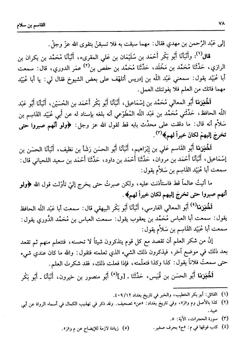 إلى عبد الرحمن بن مهدي فقال مهما سبقت به فلا تسبقن بتقوى الله عز وجل قال (1) وأنبأنا أبو بكر أحمد بن سليمان بن علي المقرى ؤ أنبأنا محمد بن بكران بن الرازي حدثنا محمد بن مخلد حدثنا محمد بن حفص بن (2) عمر الدوري قال سمعت أبا عبيد يقول سمعني عبد الله بن إدريس أتلهف على بعض الشيوخ فقال لي يا أبا عبيد مهما فاتك من العلم فلا يفوتنك العمل أخبرنا أبو المعالي محمد بن إسماعيل أنبأنا أبو بكر أحمد بن الحسين أنبأنا أبو عبد الله الحافظ حدثني محمد بن عبد الله المطوعي أنه بلغه بإسناد له عن أبي عبيد القاسم بن سلام أنه قال ما دققت على محدث بابه قط لقول الله عز وجل " ولو أنهم صبروا حتى تخرج إليهم لكان خيرا لهم " (3) أخبرنا أبو القاسم علي بن إبراهيم أنبأنا أبو الحسن رشأ بن نظيف أنبأنا الحسن بن إسماعيل أنبأنا أحمد بن مروان حدثنا أحمد بن داود حدثنا أحمد بن سعيد اللحياني قال سمعت أبا عبيد القاسم بن سلام يقول ما أتيت عالما قط فاستأذنت عليه ولكن صبرت حتى يخرج إلي تأولت قول الله " ولو أنهم صبروا حتى تخرج إليهم لكان خيرا لهم " أخبرنا (4) أبو المعالي الفارسي أنبأنا أبو بكر البيهقي قال سمعت أبا عبد الله الحافظ يقول سمعت أبا العباس محمد بن يعقوب يقول سمعت العباس بن محمد الدوري يقول سمعت أبا عبيد القاسم بن سلام يقول إن من شكر العلم أن تقصد مع كل قوم يتذكرون شيئا لا تحسنه فتتعلم منهم ثم تقعد بعد ذلك في موضع آخر فيذكرون ذلك الشئ الذي تعلمته فتقول والله ما كان عندي شئ حتى سمعت فلانا يقول كذا وكذا فتعلمته فإذا فعلت ذلك فقد شكرت العلم أخبرنا أبو الحسن بن قبيس حدثنا و (5) أبو منصور بن خيرون أنبأنا أبو بكر