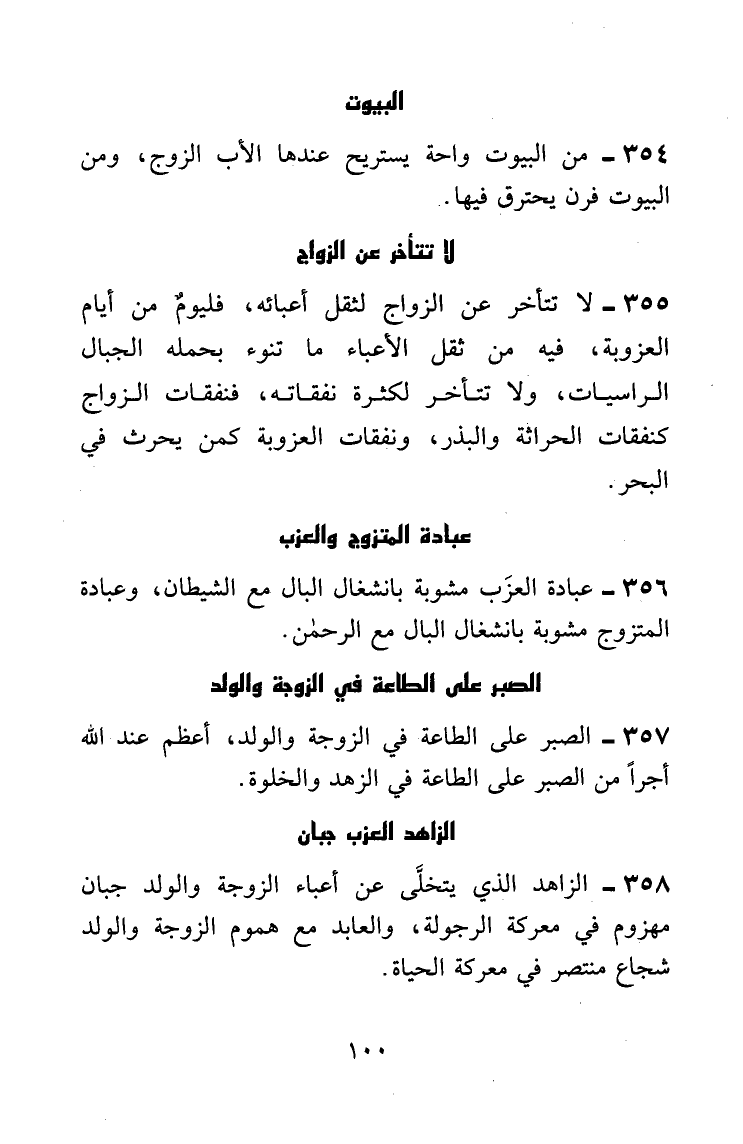 الزاهد الذي يتخلَّى عن أعباء الزوجة والولد جبان مهزوم في معركة الرجولة، والعابد مع هموم الزوجة والولد شجاع منتصر في معركة الحياة.