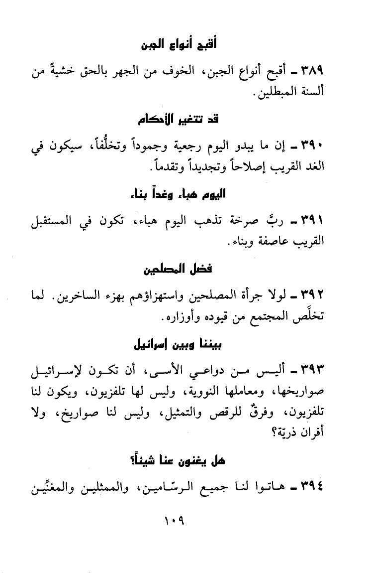 أليس من دواعي الأسى، أن تكون لإسرائيل صواريخها، ومعاملها النووية، وليس لها تلفزيون، ويكون لنا تلفزيون، وفرق للرقص والتمثيل، وليس لنا صواريخ، ولا أفران ذرية؟