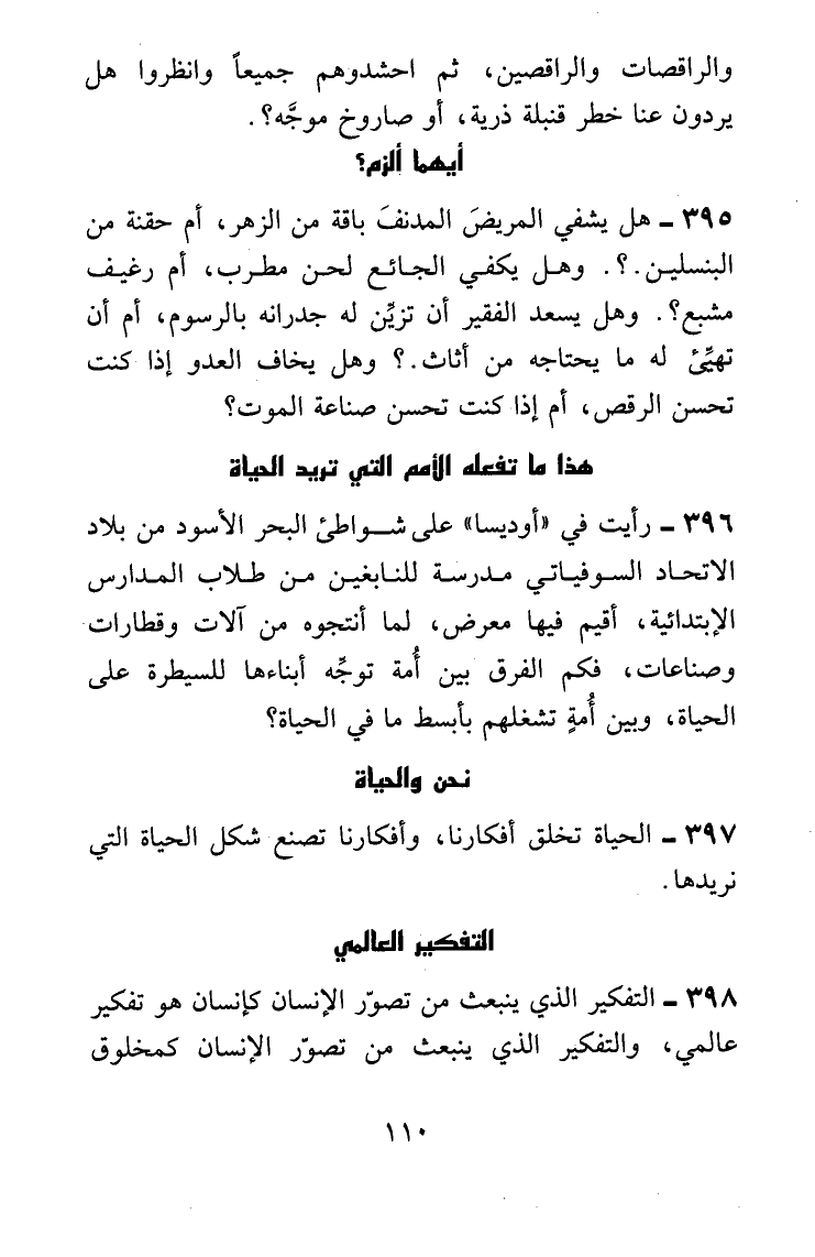 هل يشفي المريض المدنف باقة من الزهر، أم حقنة من البنسلين؟ وهل يكفي الجائع لحن مطرب، أم رغيف مشبع؟. وهل يسعد الفقير أن تزيَّن له جدرانه بالرسوم، أم أن تهيئ له ما يحتاجه من أثاث؟ وهل يخاف العدو إذا كنت تحسن الرقص، أم إذا كنت تحسن صناعة الموت؟